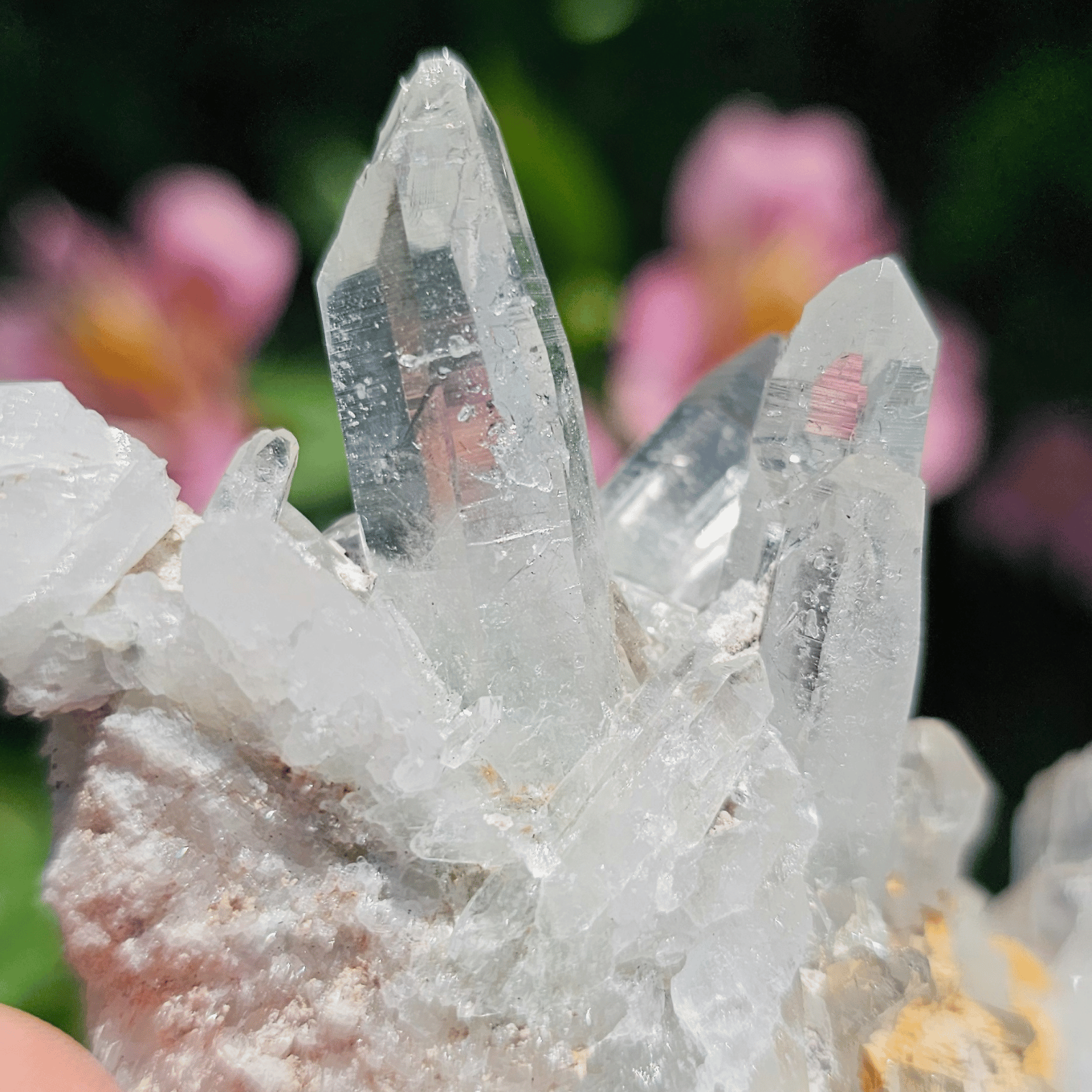 太く、吸い込まれるような透明度を誇るポイント。根元には、大地のエネルギーそのものであるリモナイトやクローライトが溶け込み、淡い黄金色や神秘的な緑の輝きを放ちます。時には、天と地の力を結ぶダブルポイントとして、力強い姿を現すことも。