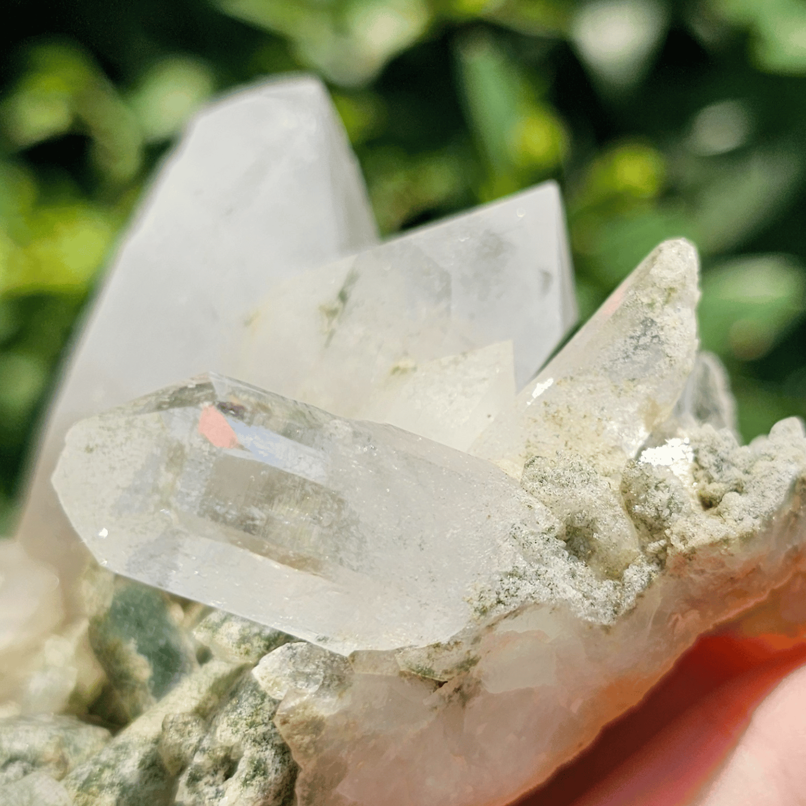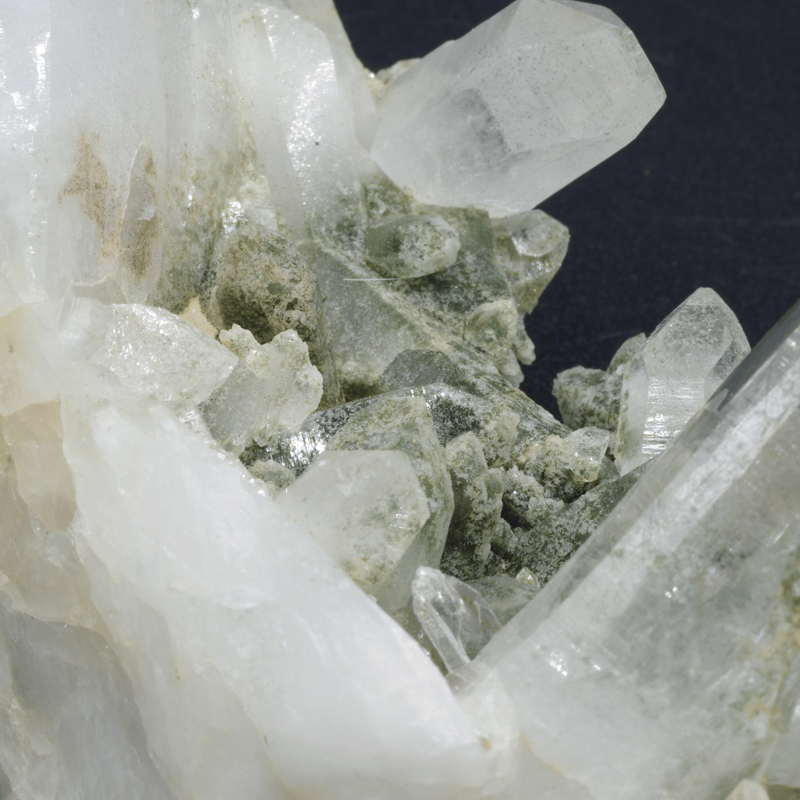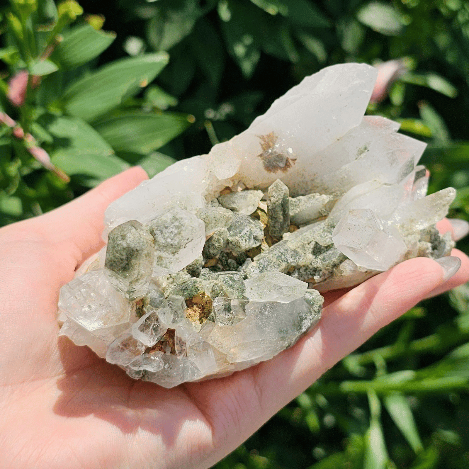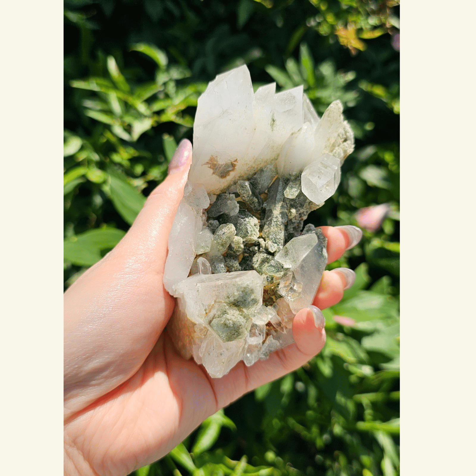 クリアでクローライトが入った結晶やホワイトの結晶、クローライトがいっぱいに内包されたグリーンの結晶と、様々な結晶が1つの石に育つ珍しいクラスターです。