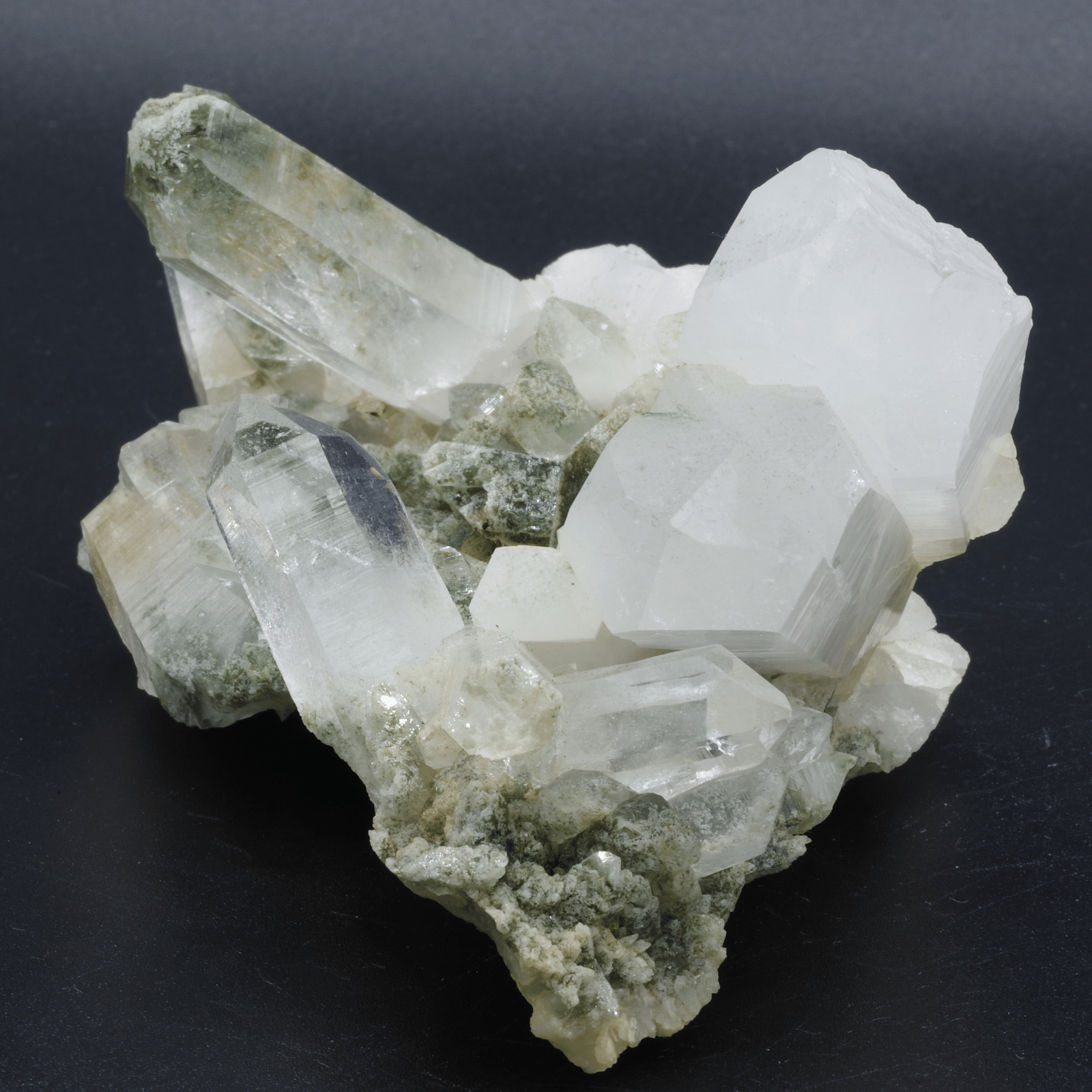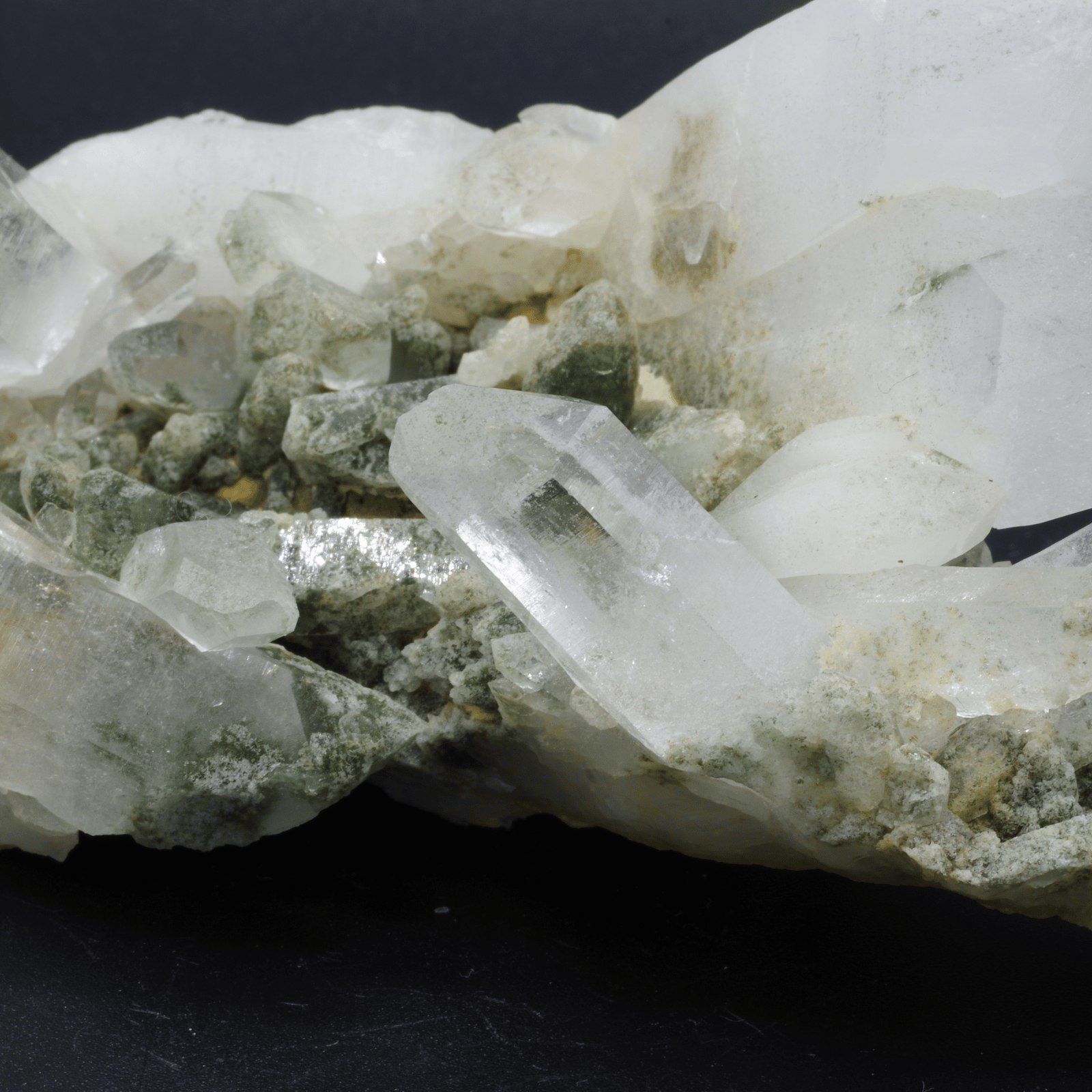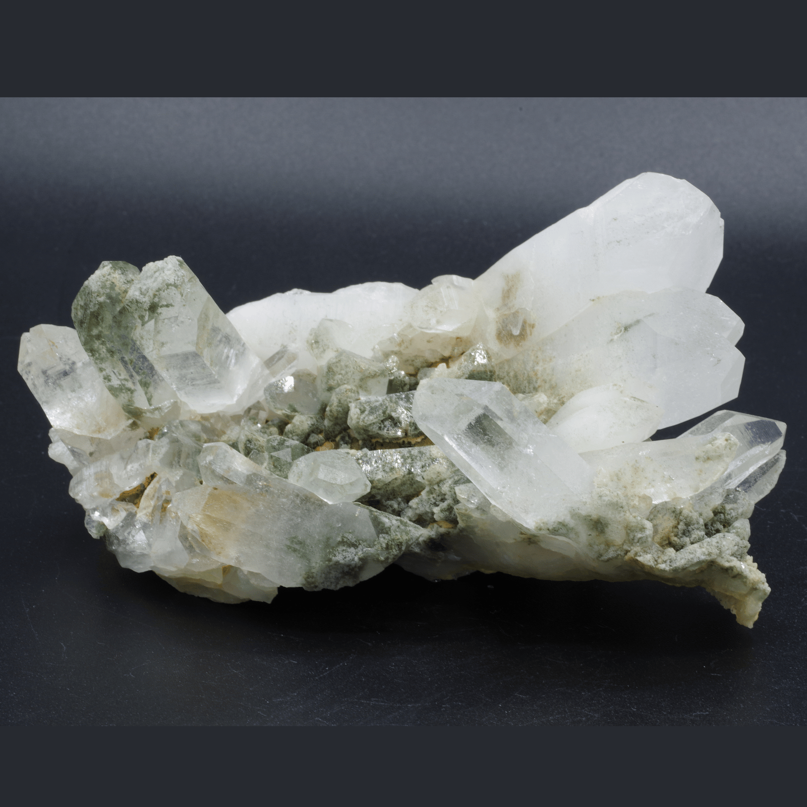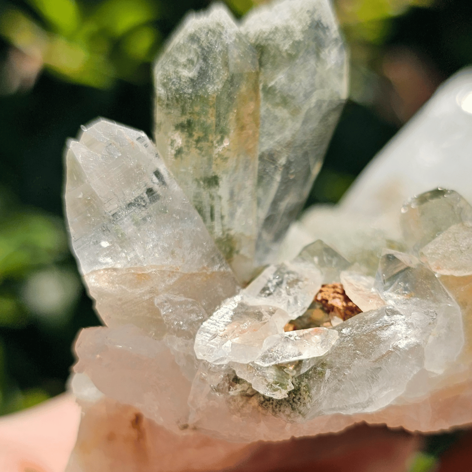 クリアでクローライトが入った結晶やホワイトの結晶、クローライトがいっぱいに内包されたグリーンの結晶と、様々な結晶が1つの石に育つ珍しいクラスターです。