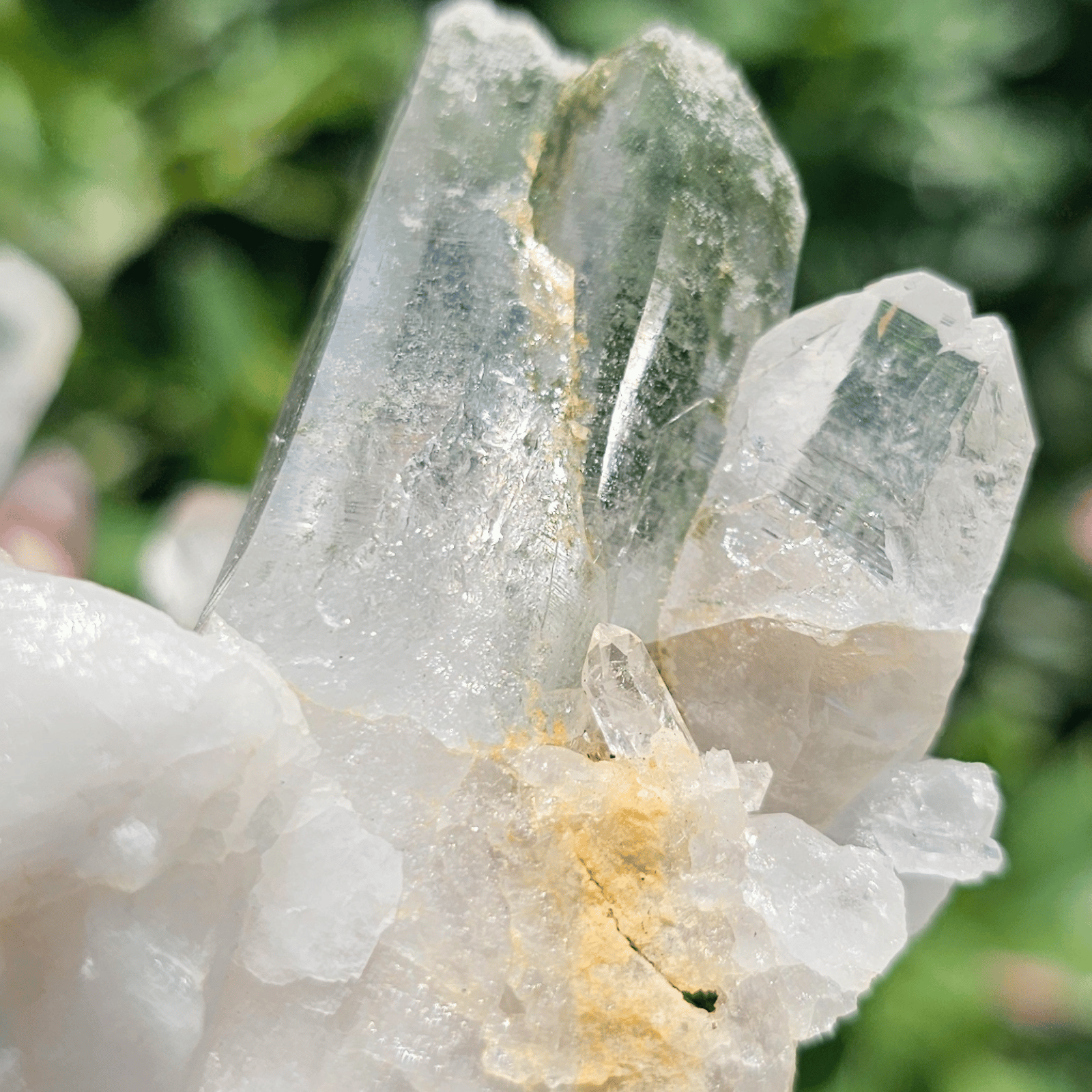 根元に含まれるリモナイトやクローライトによって淡い黄色やグリーンに輝く結晶や