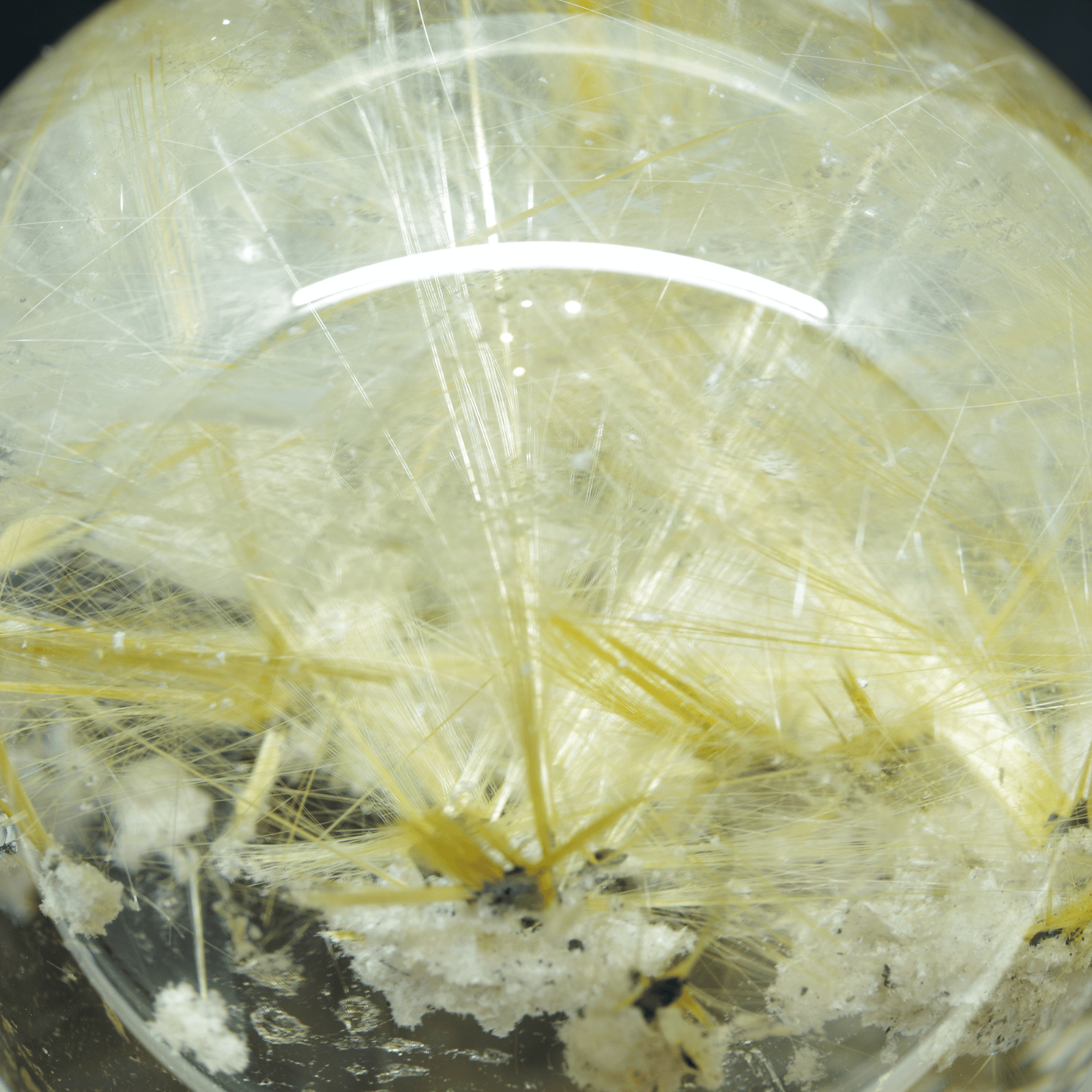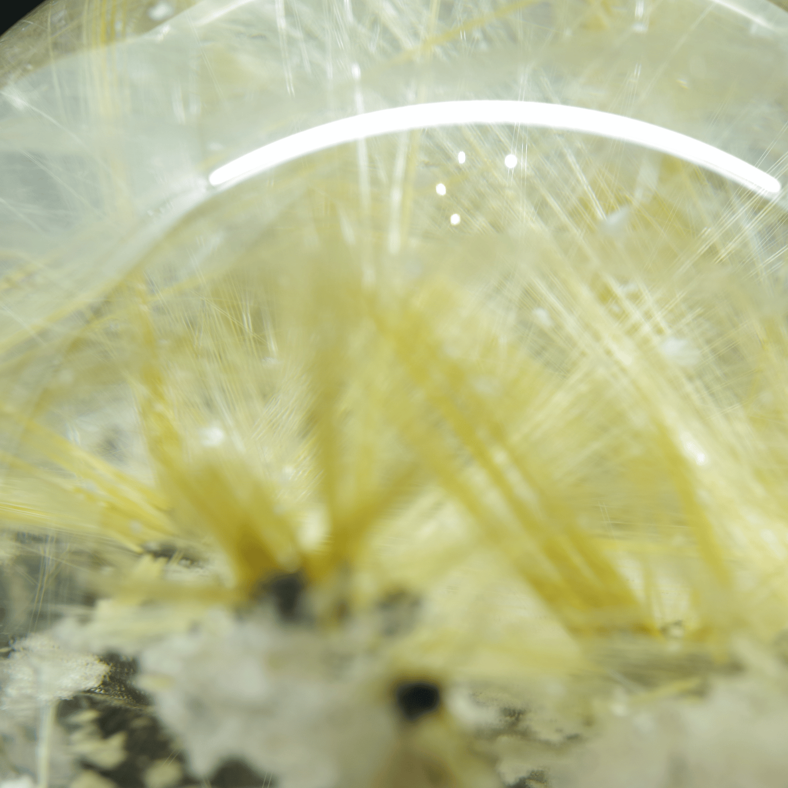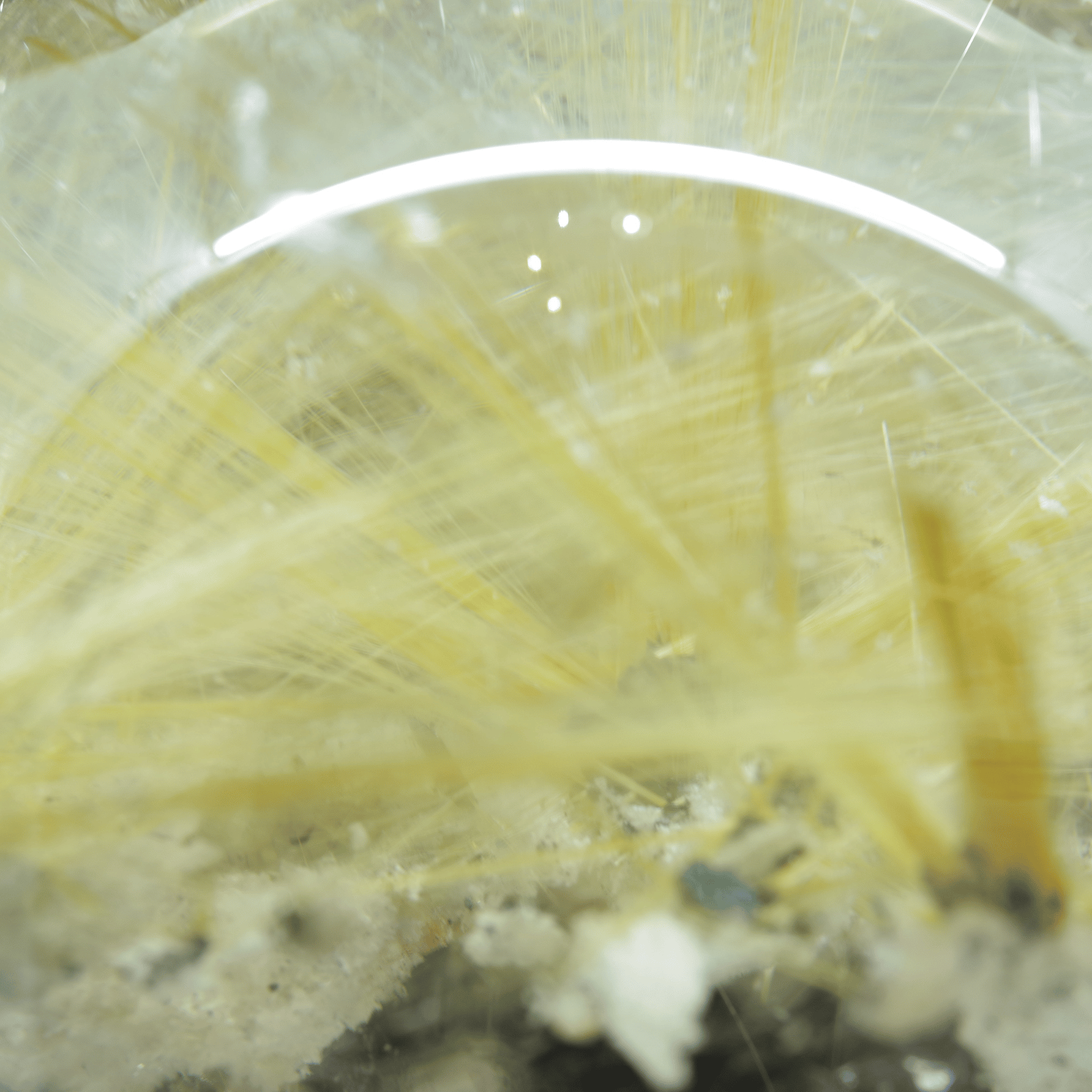 こちらは太陽のような輝きを放つ太陽放射ルチルクォーツと大地のエネルギーを宿すガーデンクォーツがひとつに共生した大変珍しいスフィアです。