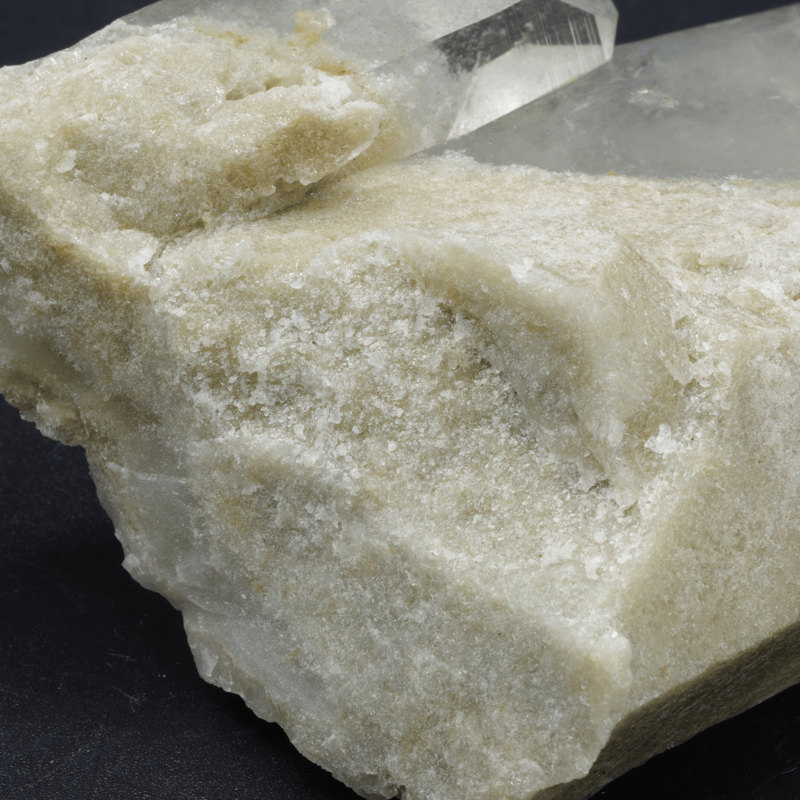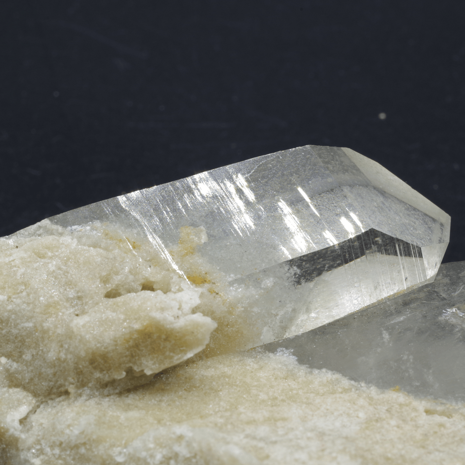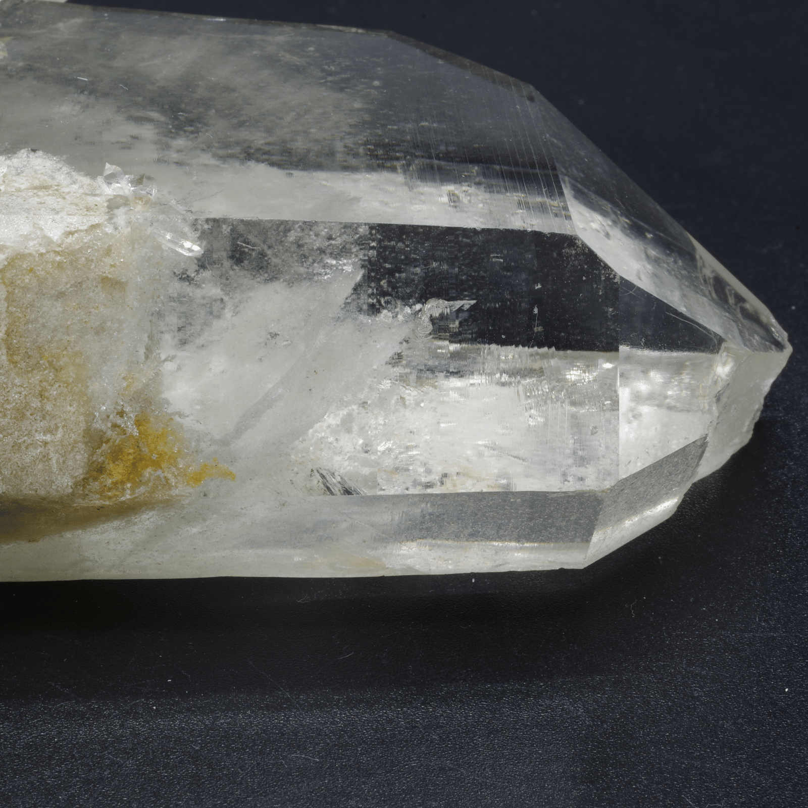 根元に含まれるリモナイトやクローライトによって淡い黄色やグリーンに輝く結晶や