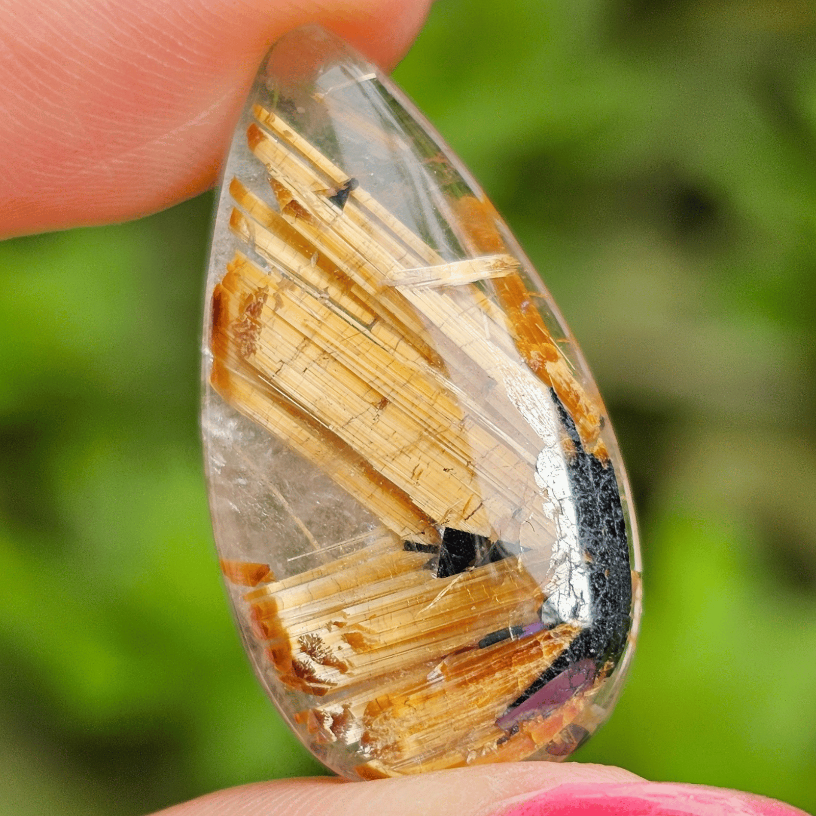 クリアな水晶内にヘマタイトから力強く伸びる太い針の太陽放射ルチルクォーツのルース。