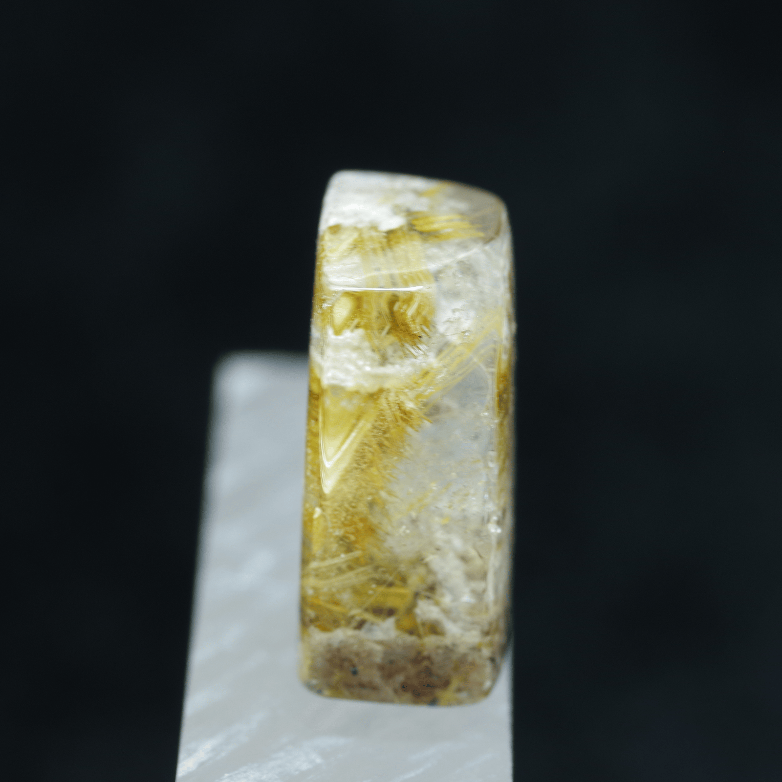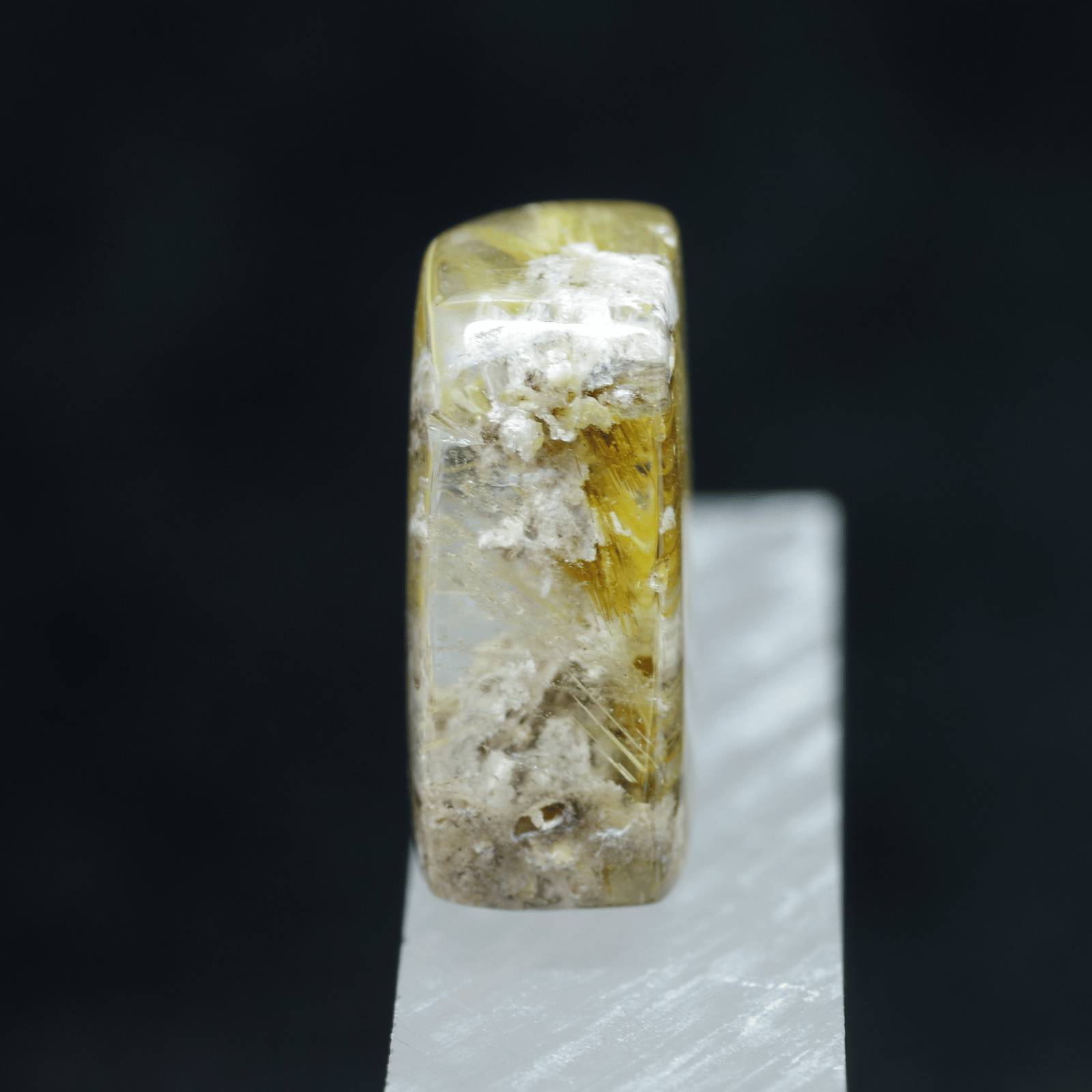 ゴールドの針がいくつも重なり力強く輝くルチルと、ふわふわとした綿のようなガーデンが共生するルースです。