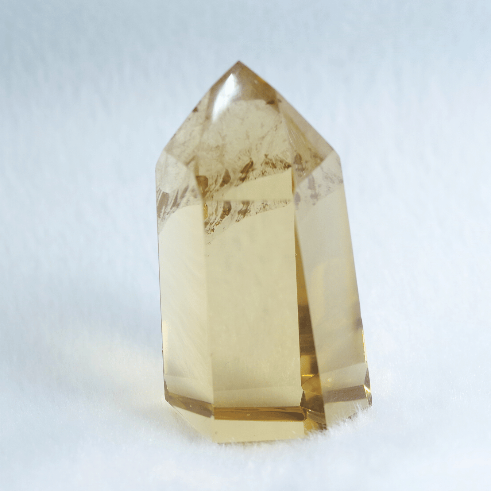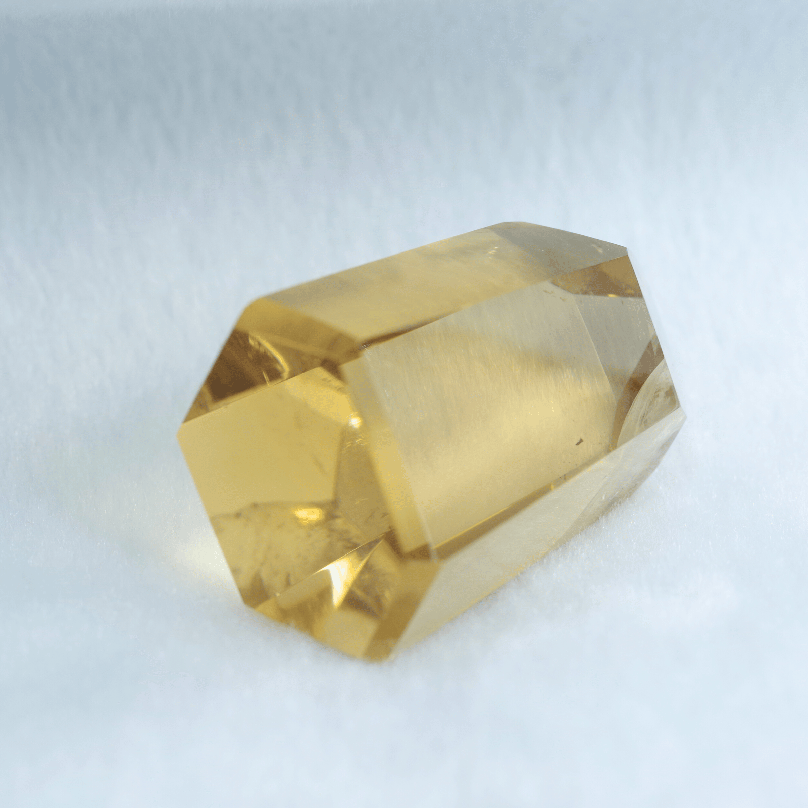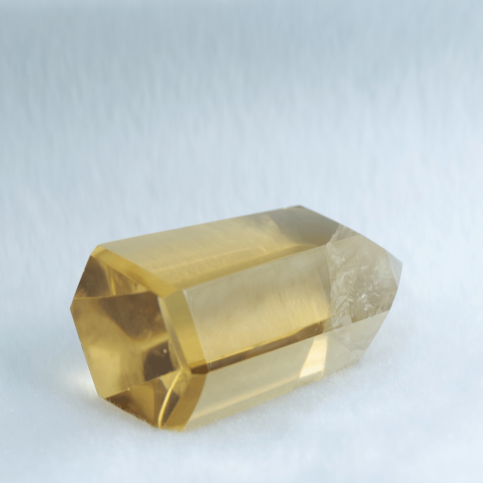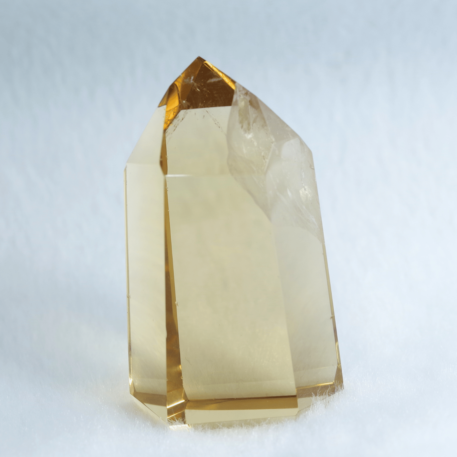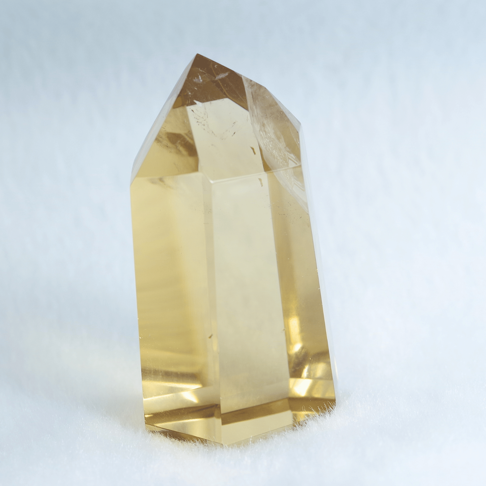 透明度の高さを生かしてポリッシュした結晶に光が差し込むと、じんわりと繁栄が広がるような温かなエネルギーを奏でます。