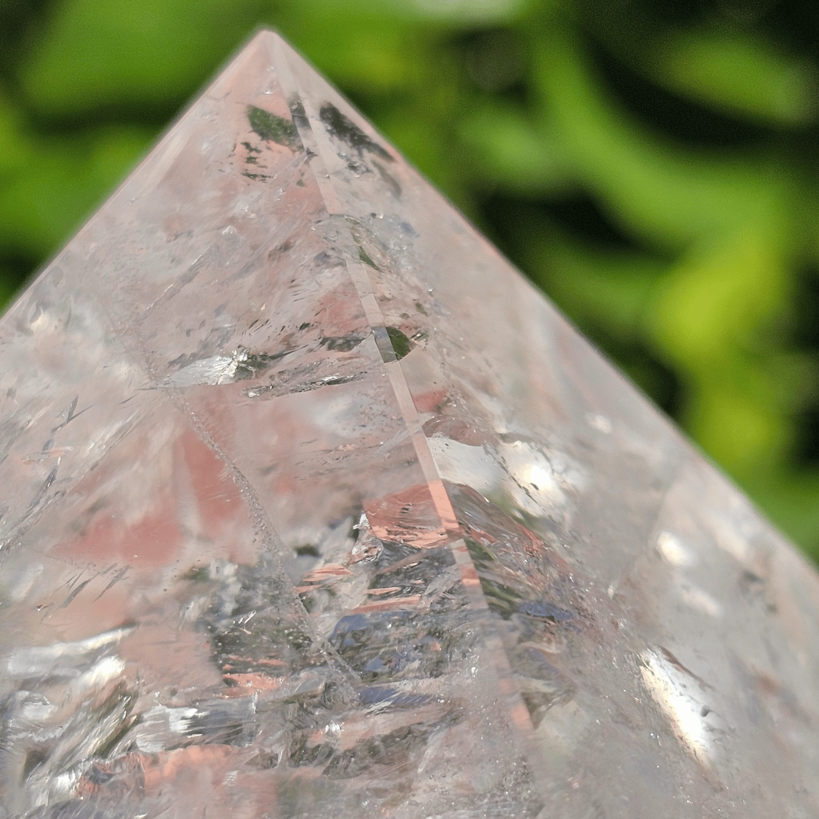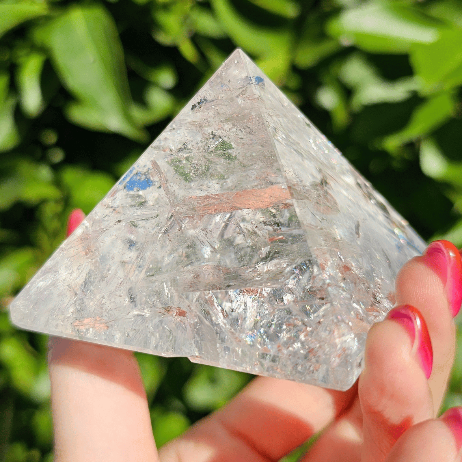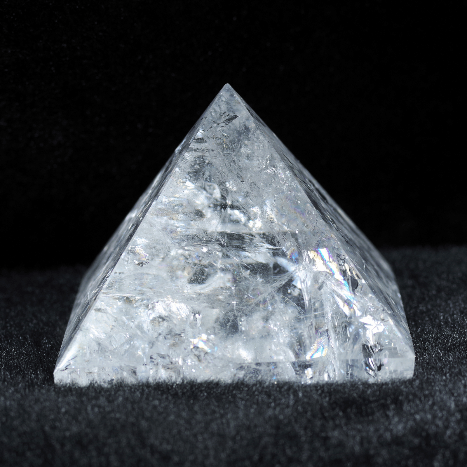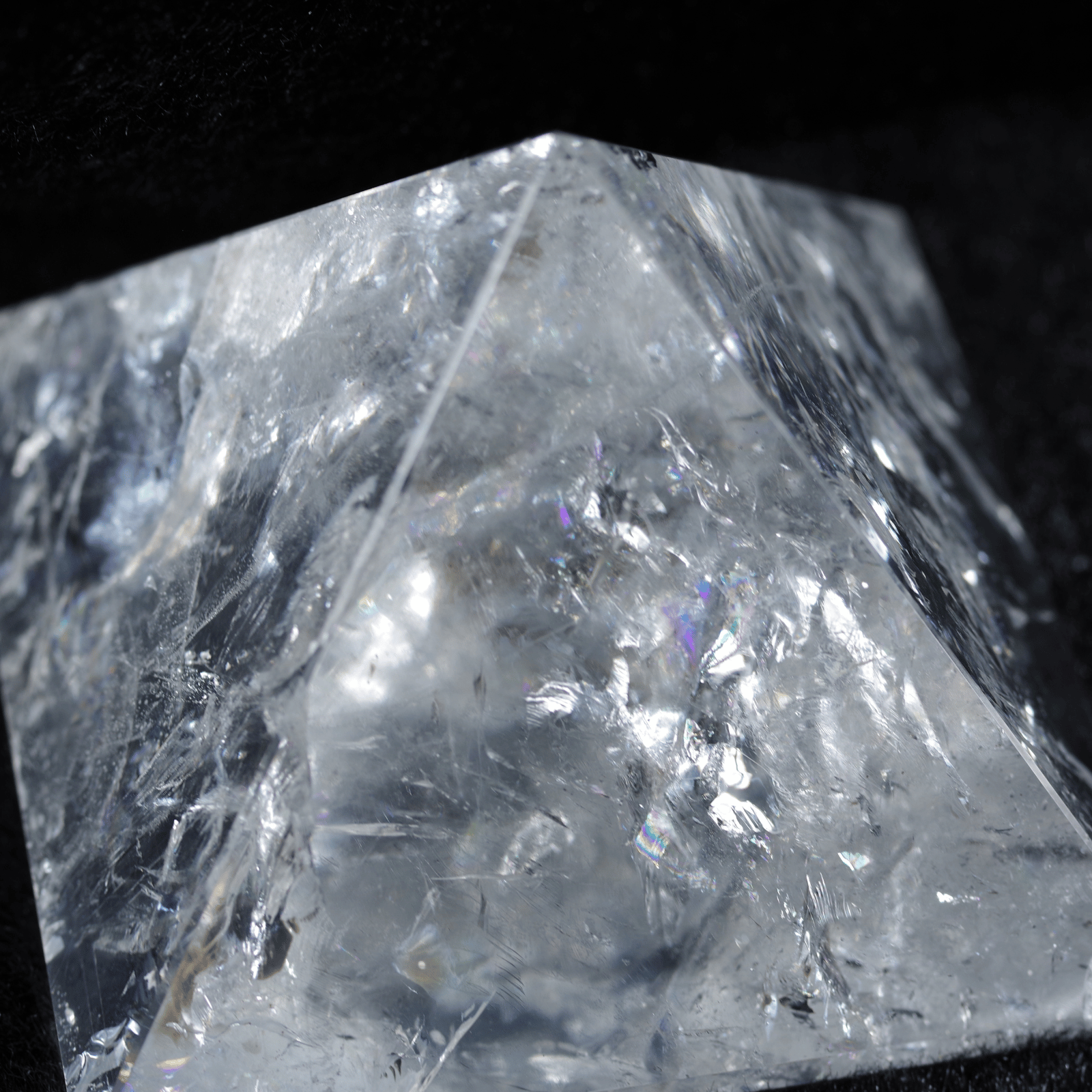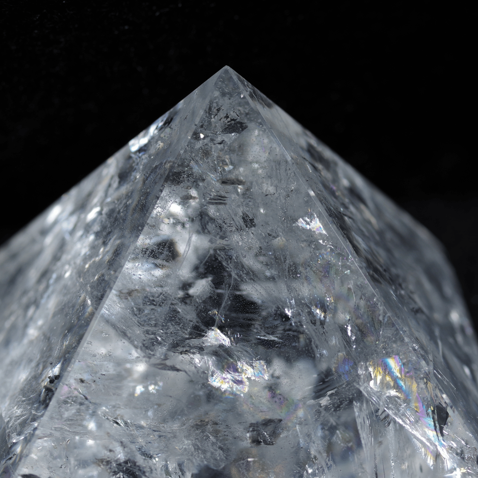 透明度の高いクリアな結晶の中に、幻想的な虹がふわりと浮かぶ希少なレムリアンシードピラミッド。