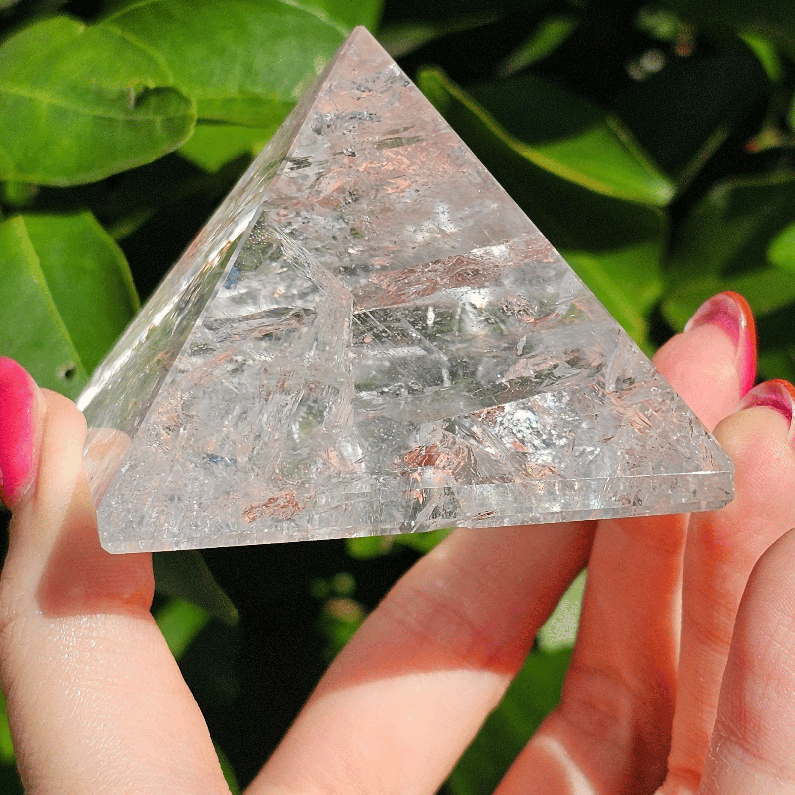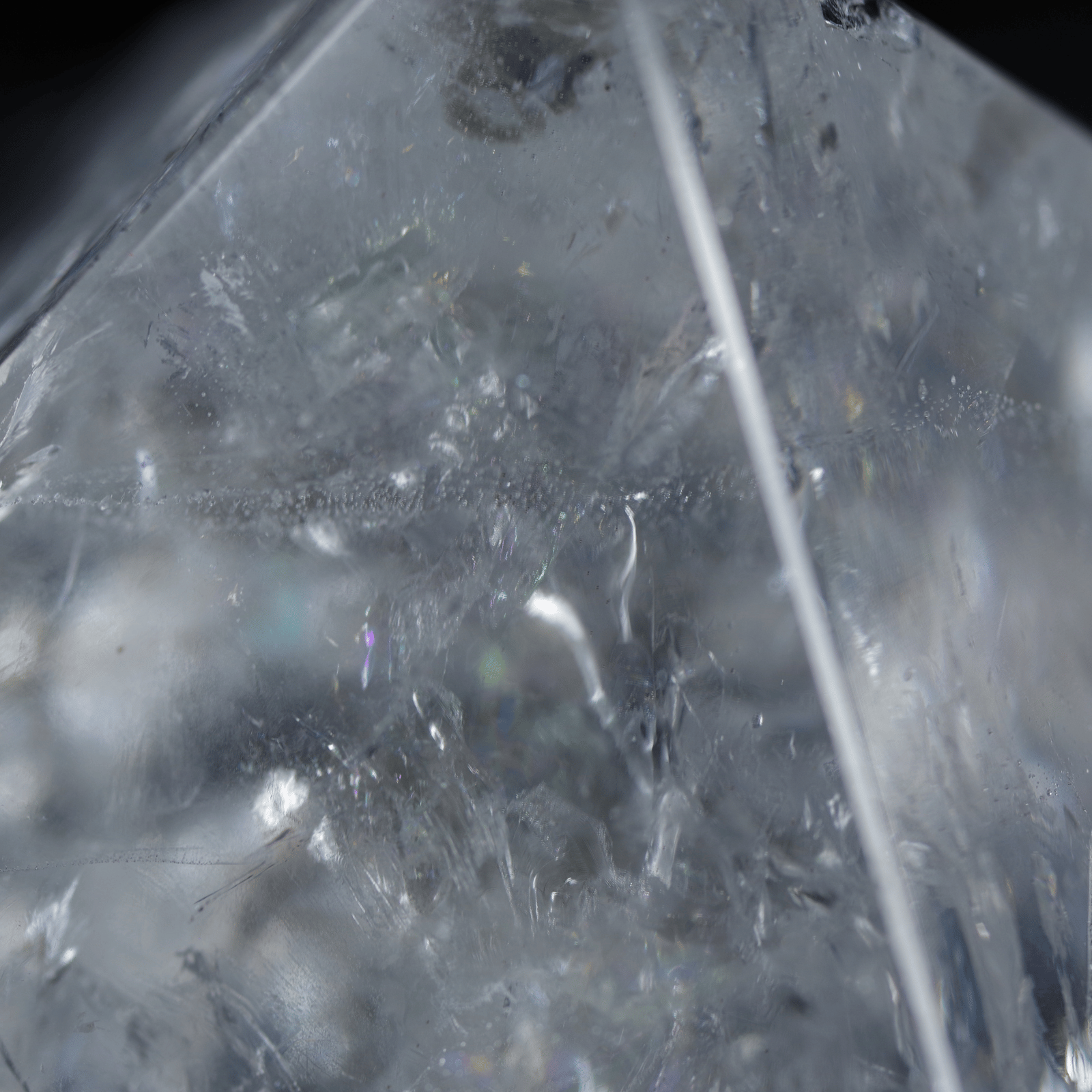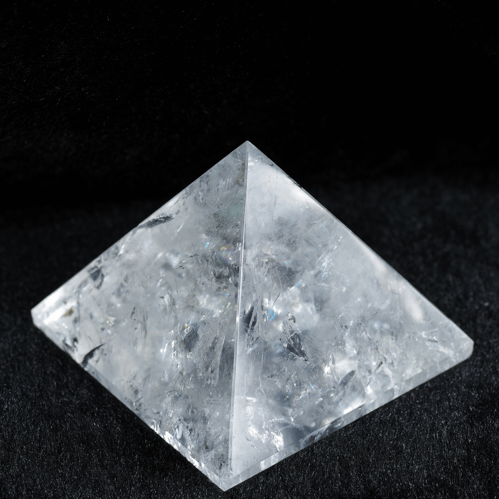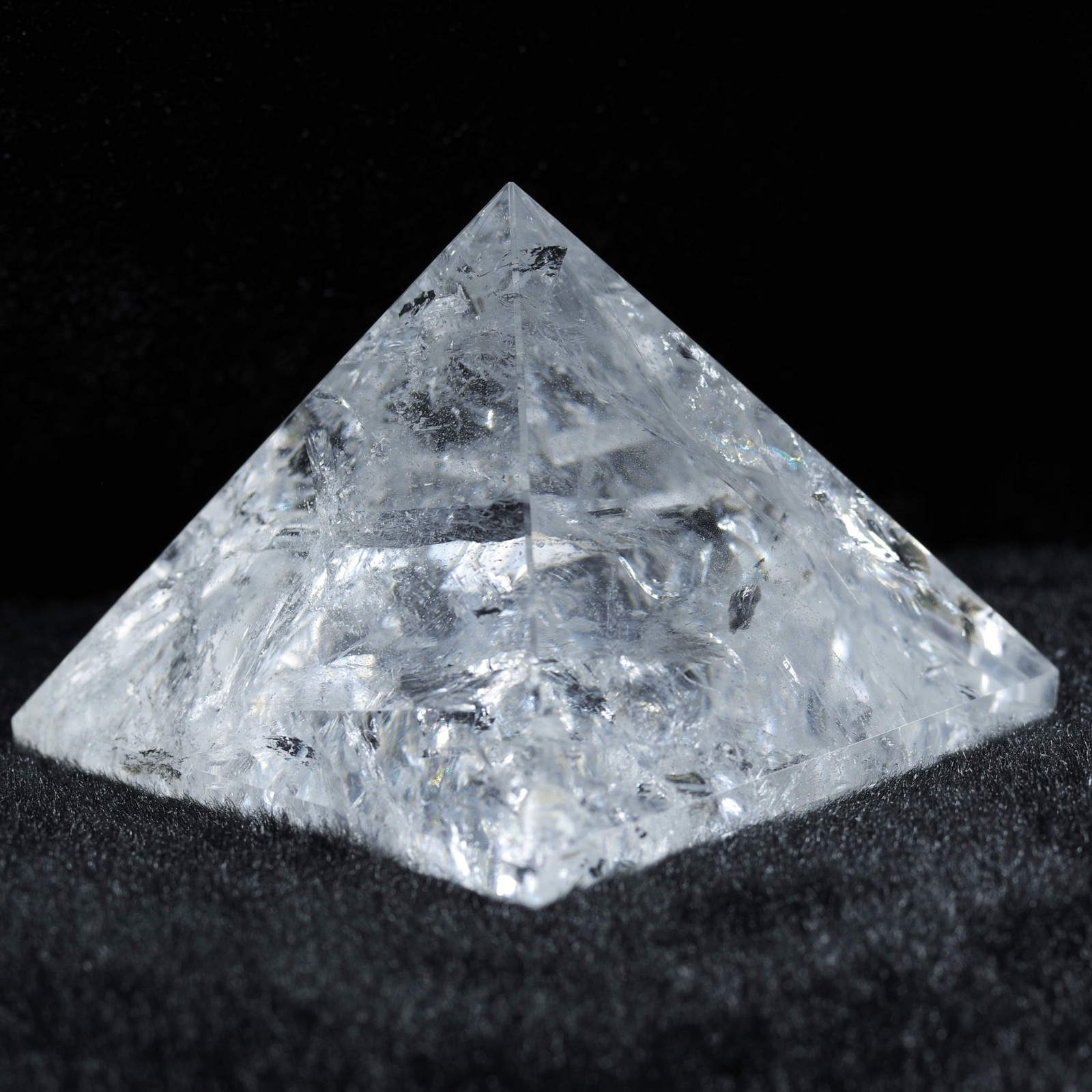 透明度の高いクリアな結晶の中に、幻想的な虹がふわりと浮かぶ希少なレムリアンシードピラミッド。