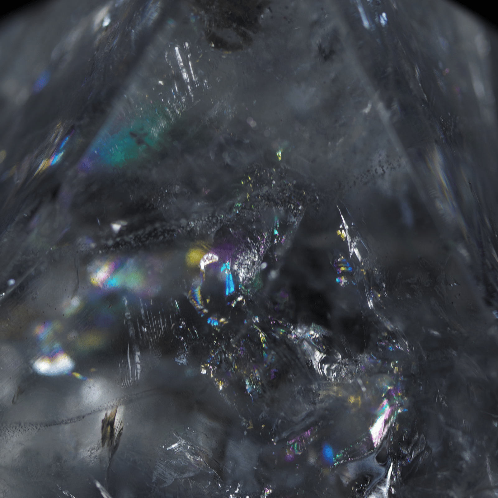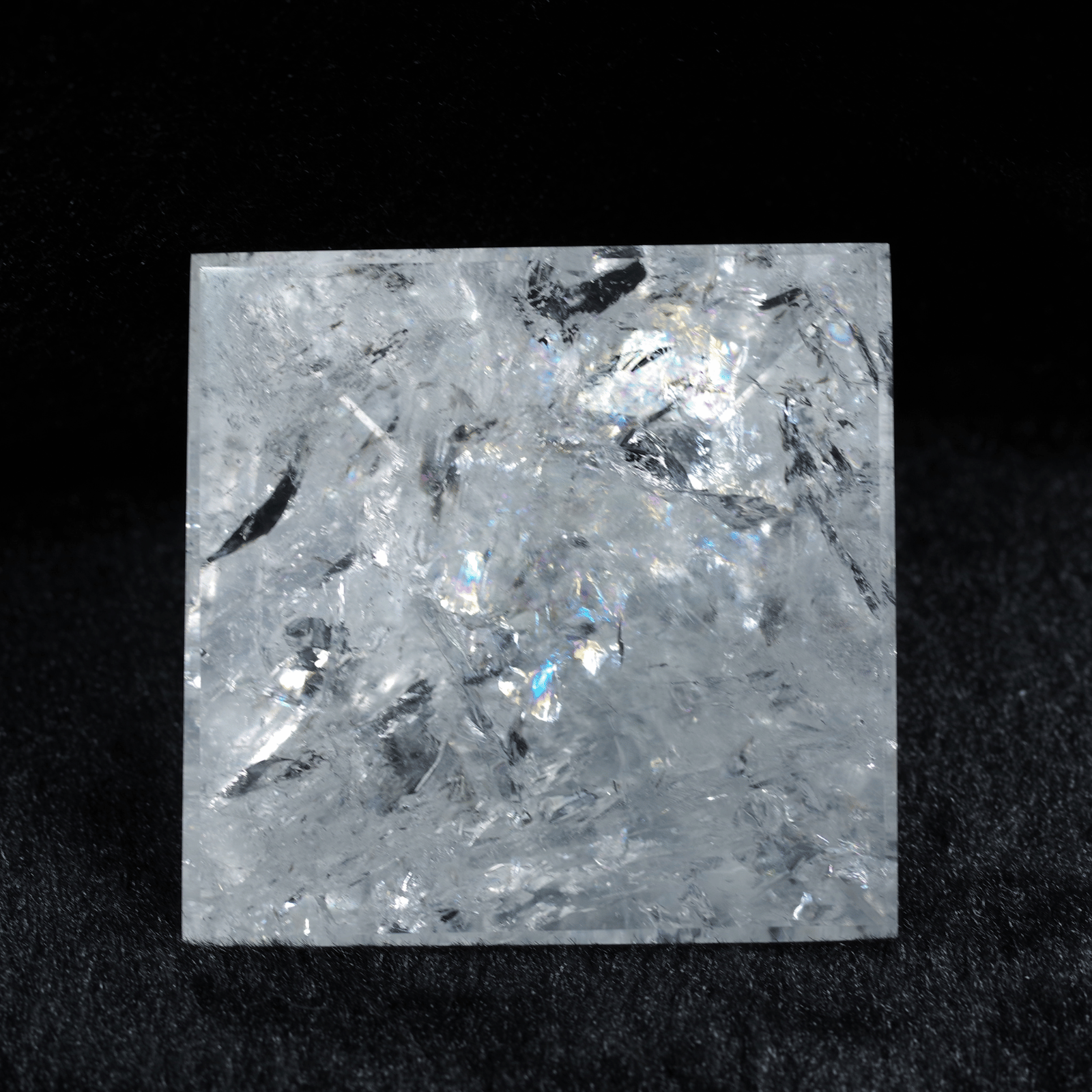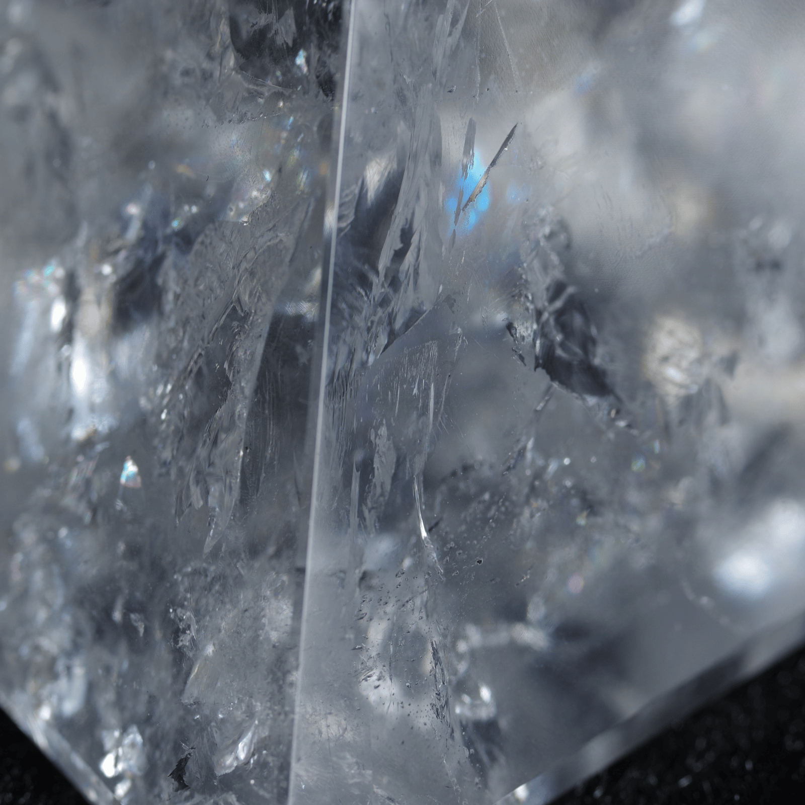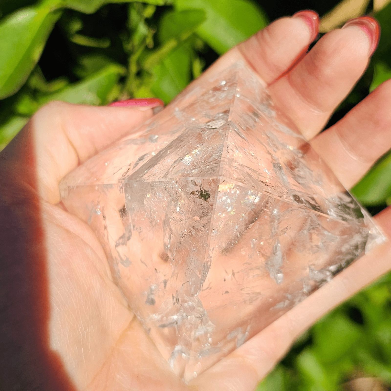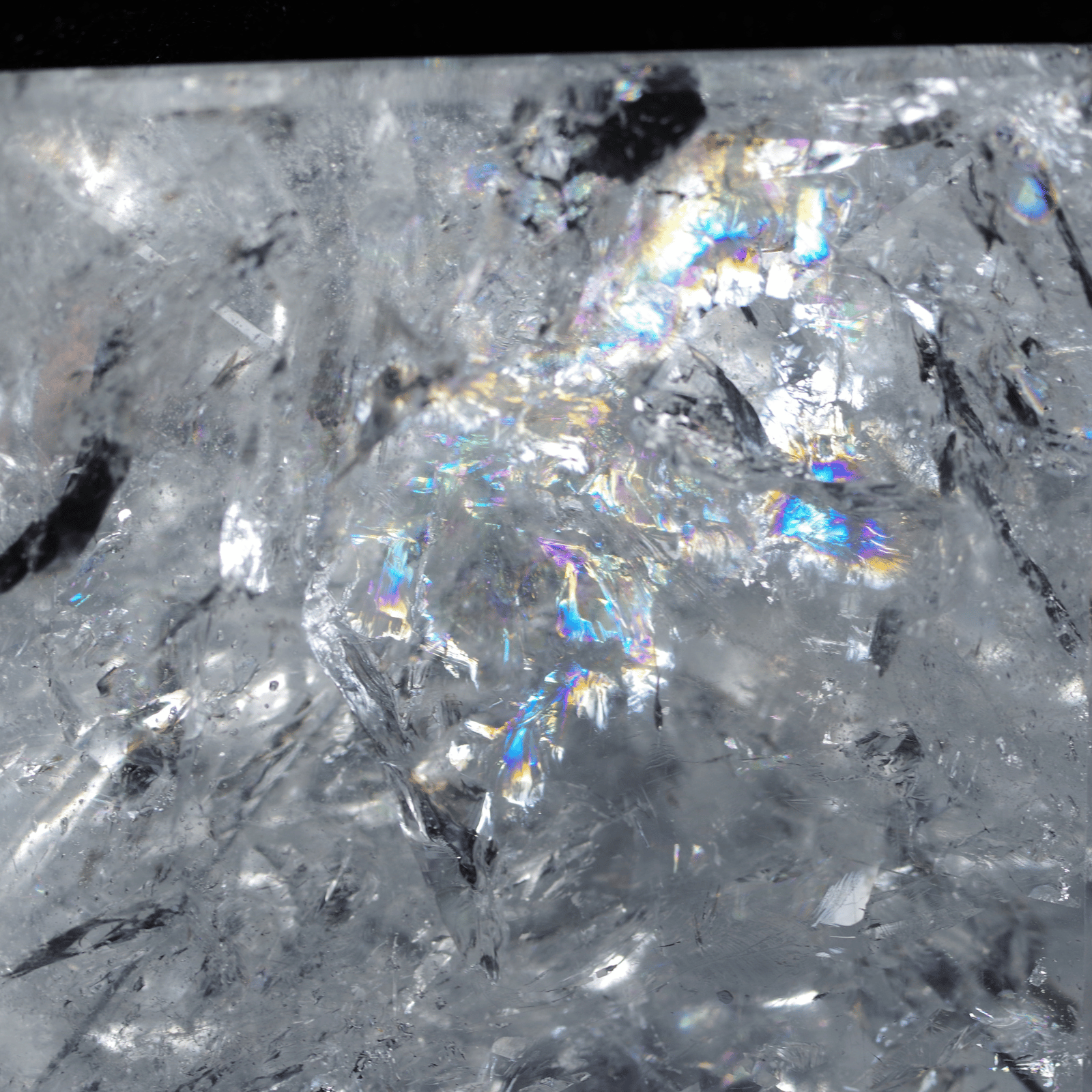 透明度の高いクリアな結晶の中に、幻想的な虹がふわりと浮かぶ希少なレムリアンシードピラミッド。