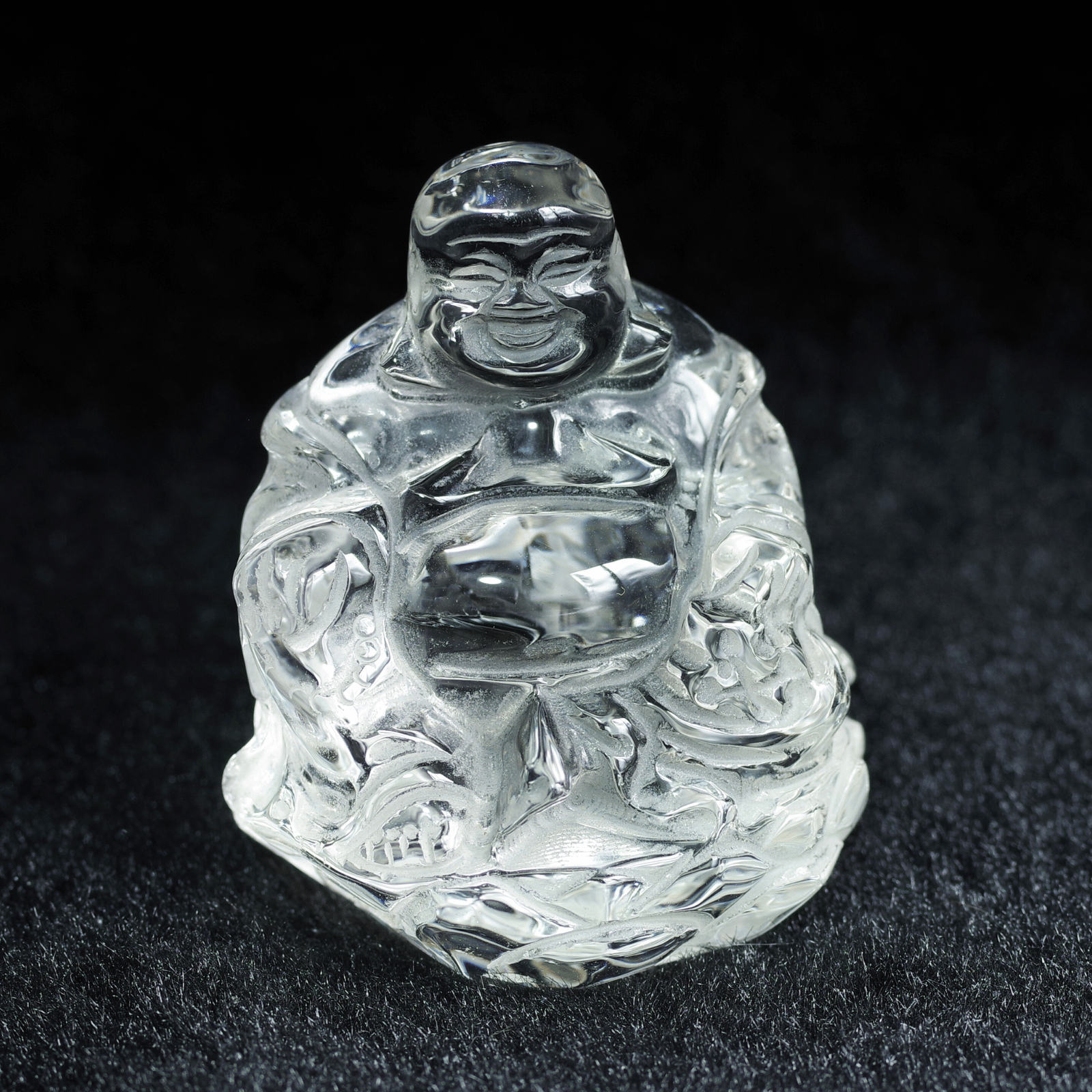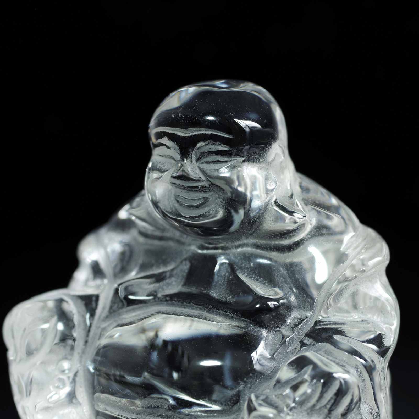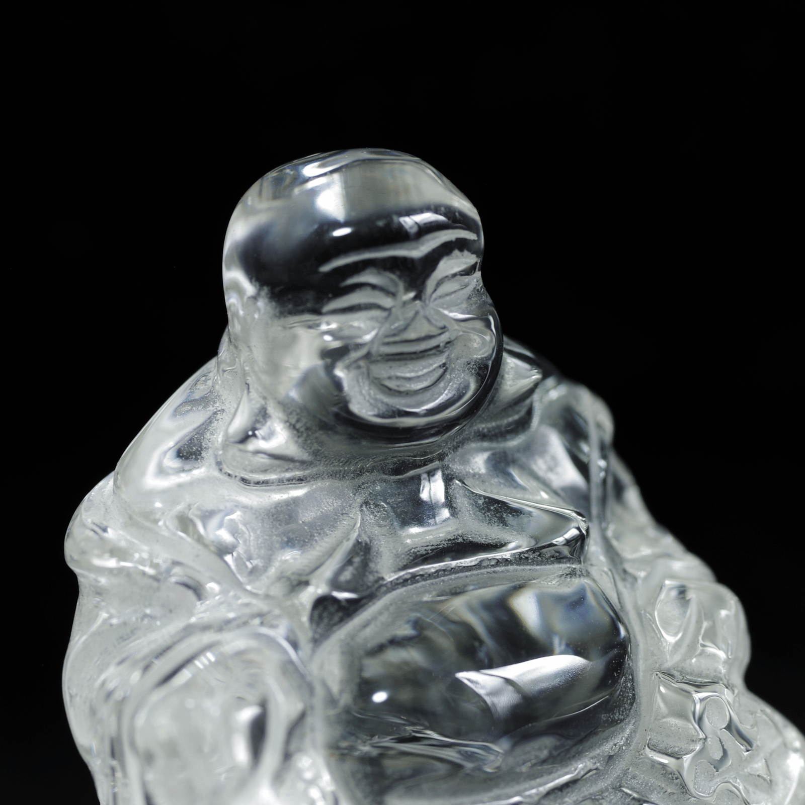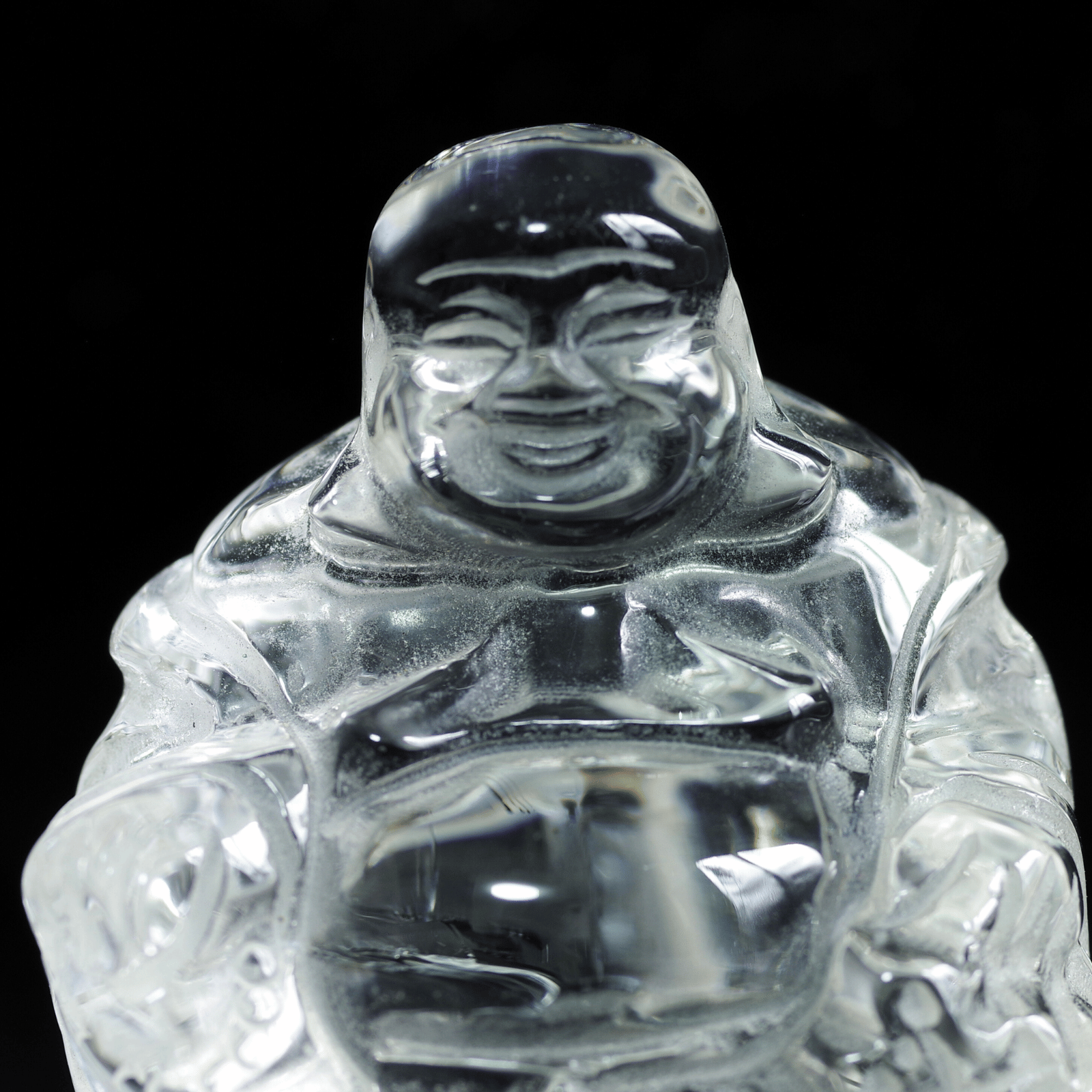 透明度の高い天然水晶から丁寧に彫り上げられた「水晶布袋尊」。