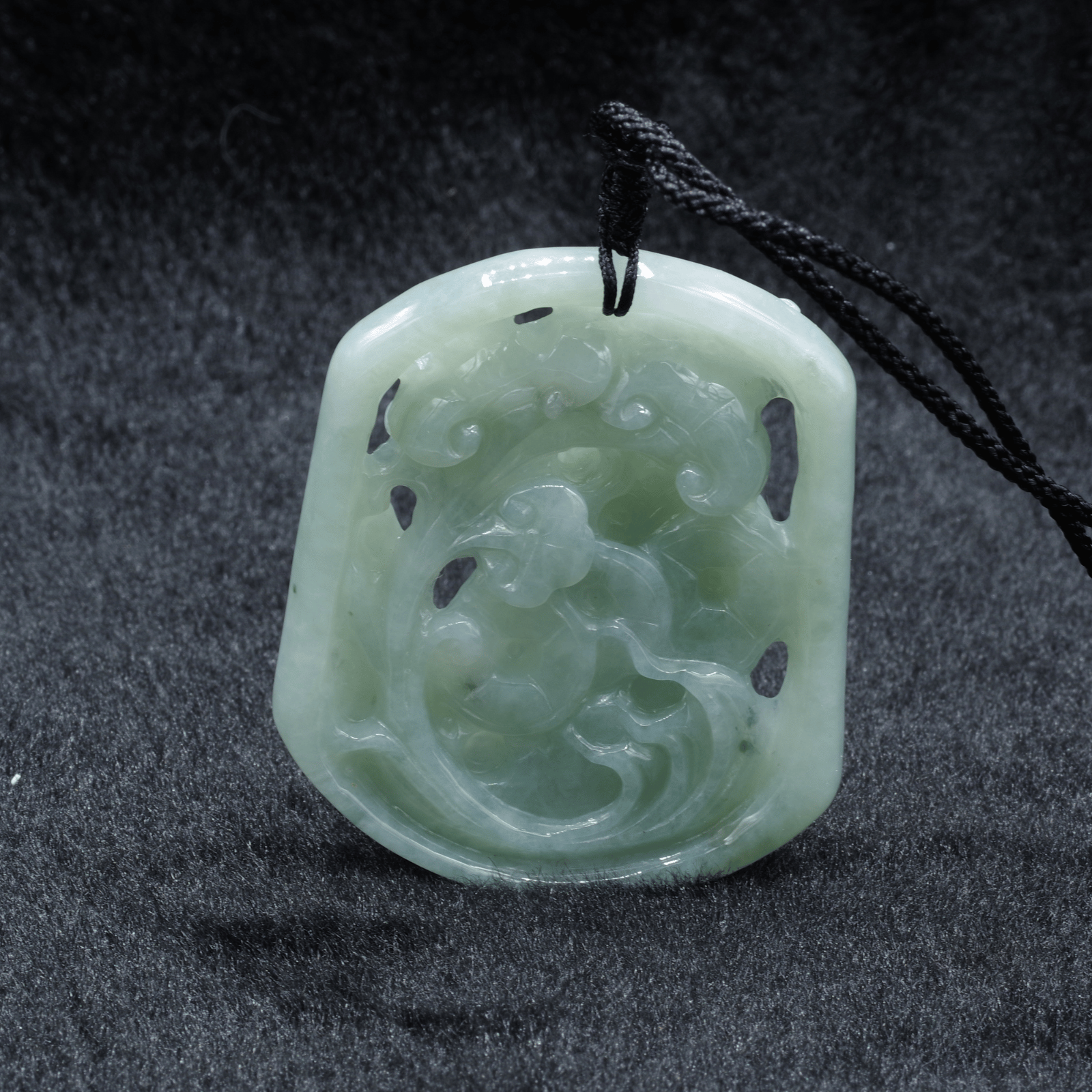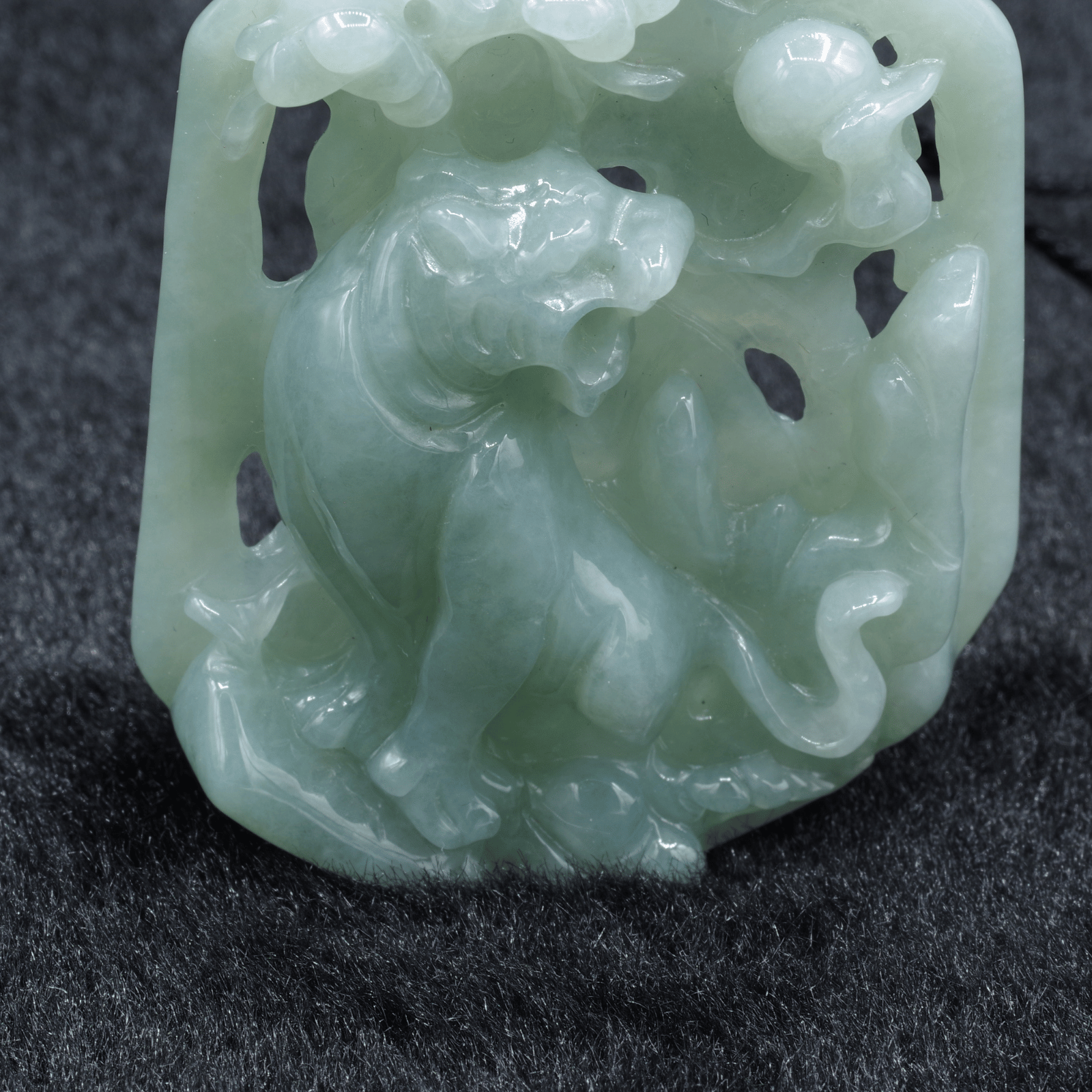 濃厚でしっとりとしたグリーンの翡翠に、堂々と鎮座する虎を彫り上げた、威厳と繁栄を守る護符。