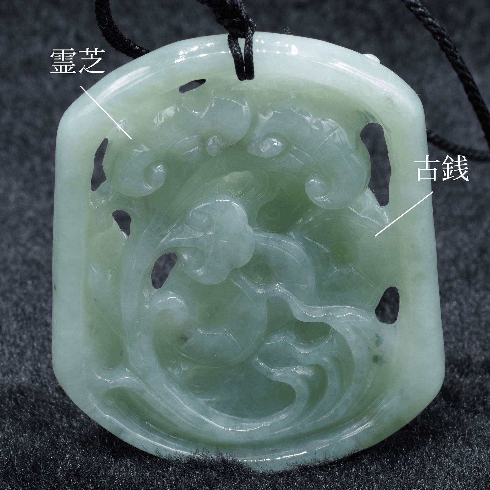 さらに裏面には、健康長寿と繁栄を司る霊芝、財を引き寄せ資産を守る古銭を彫刻。