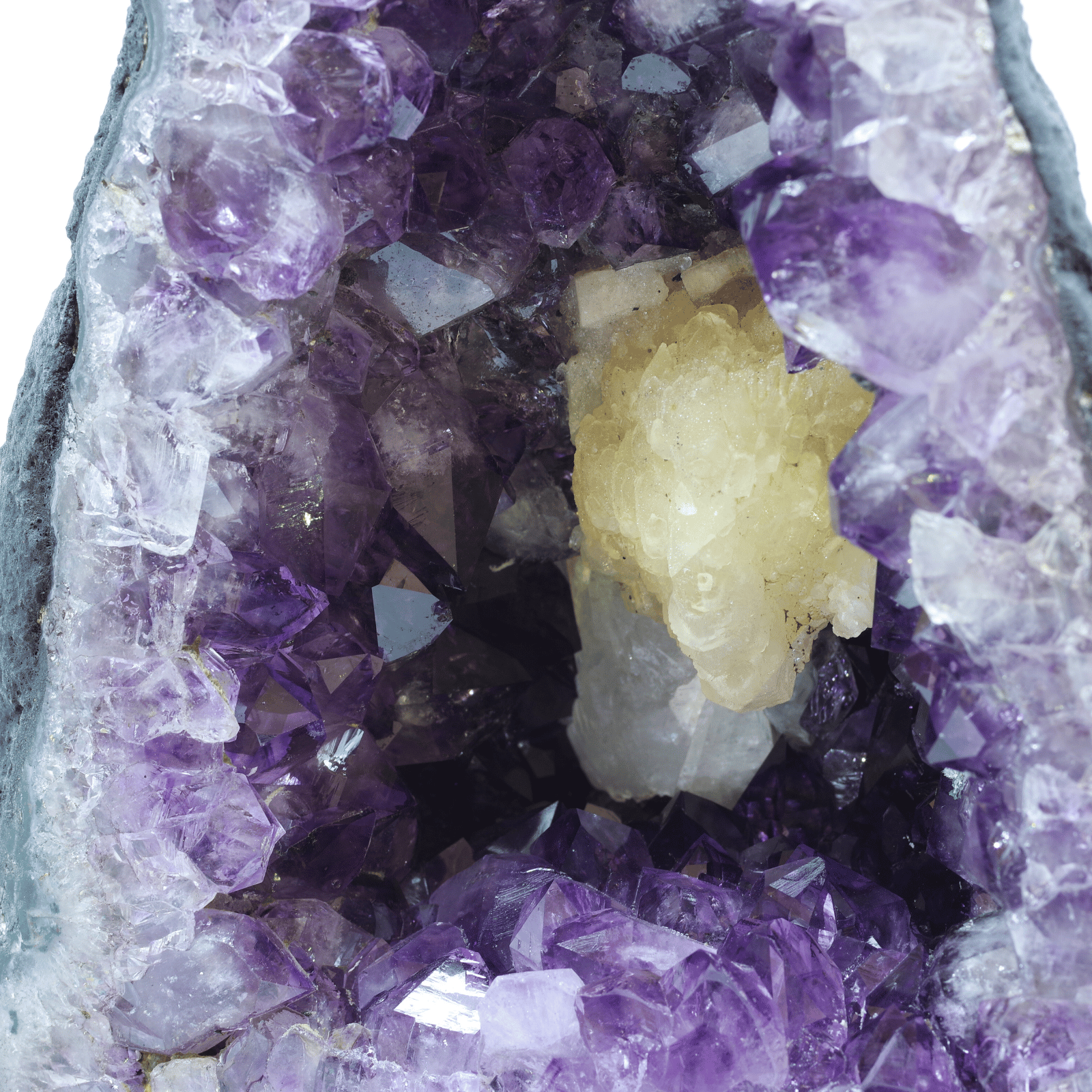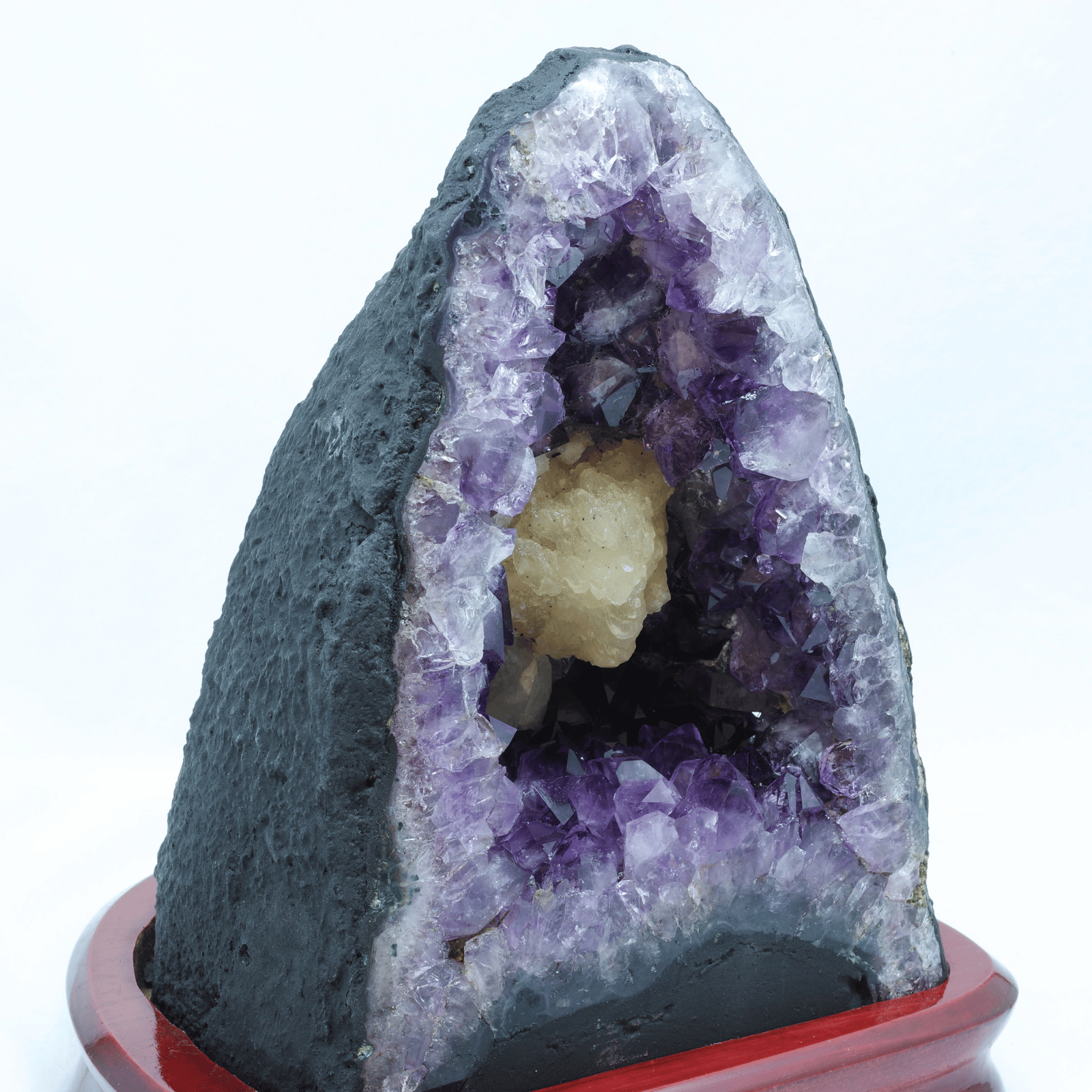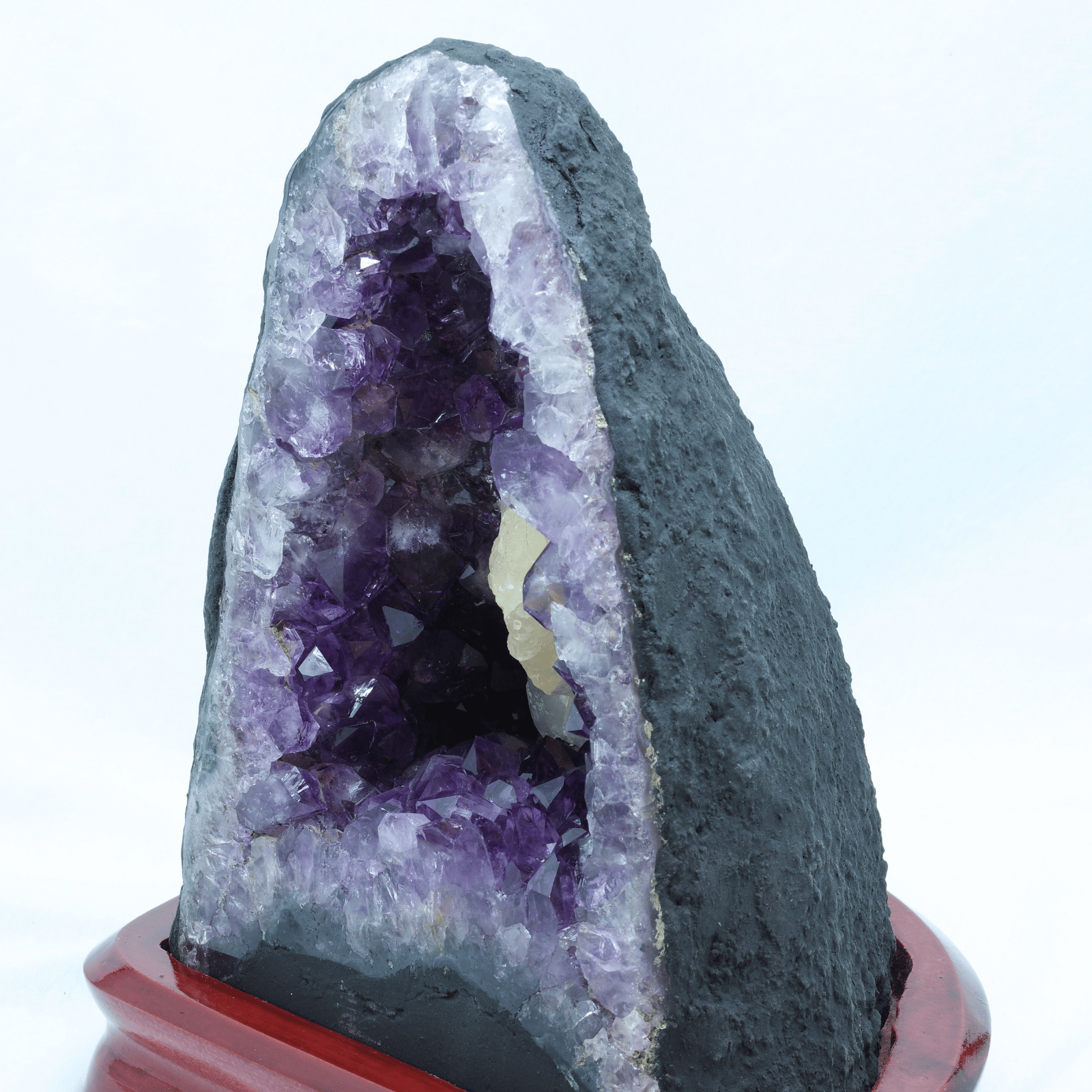 アメジスト(紫水晶)の原石が、岩の内部で自然に結晶化し、洞窟のような空洞の内側にびっしりと美しい紫の結晶を形成したものです。