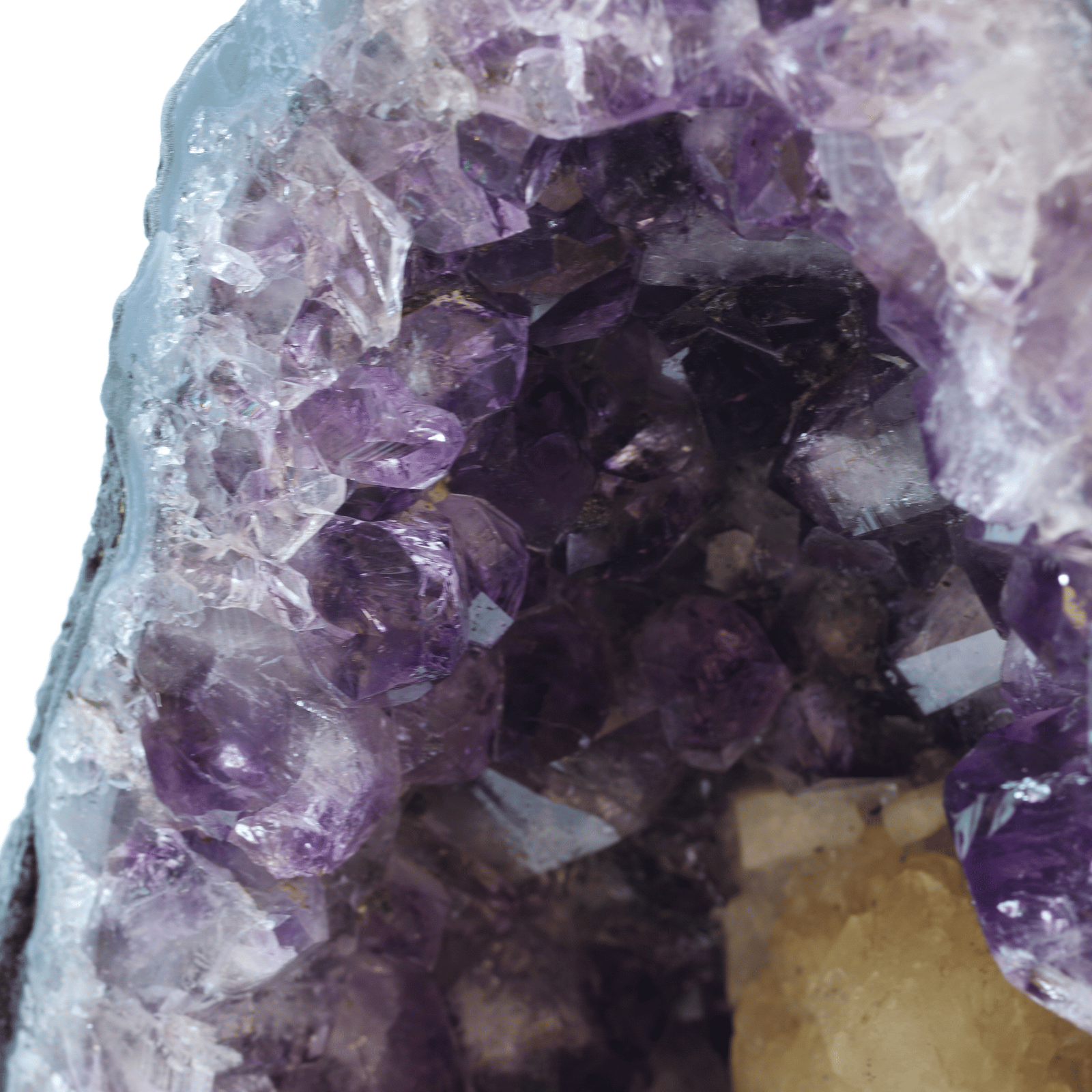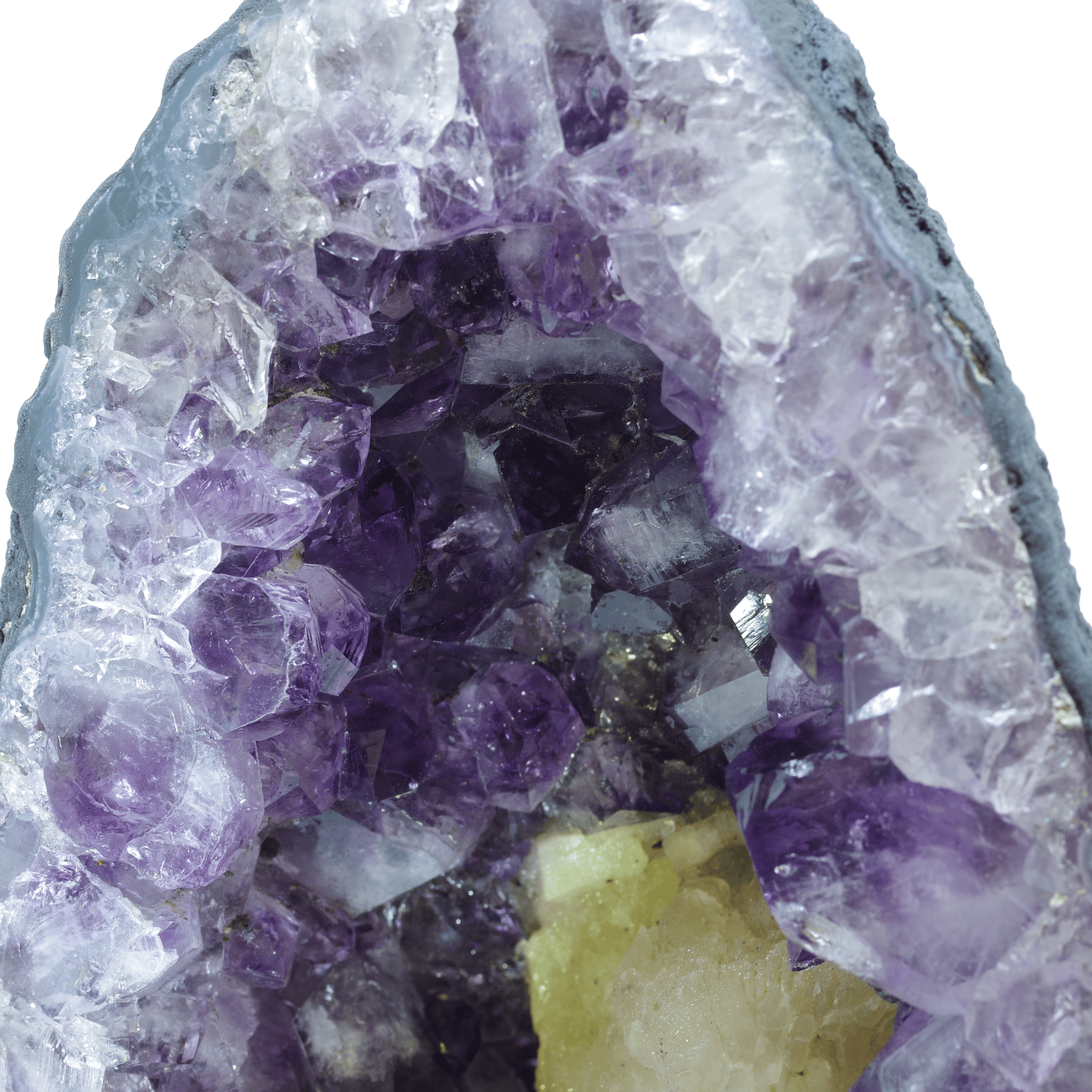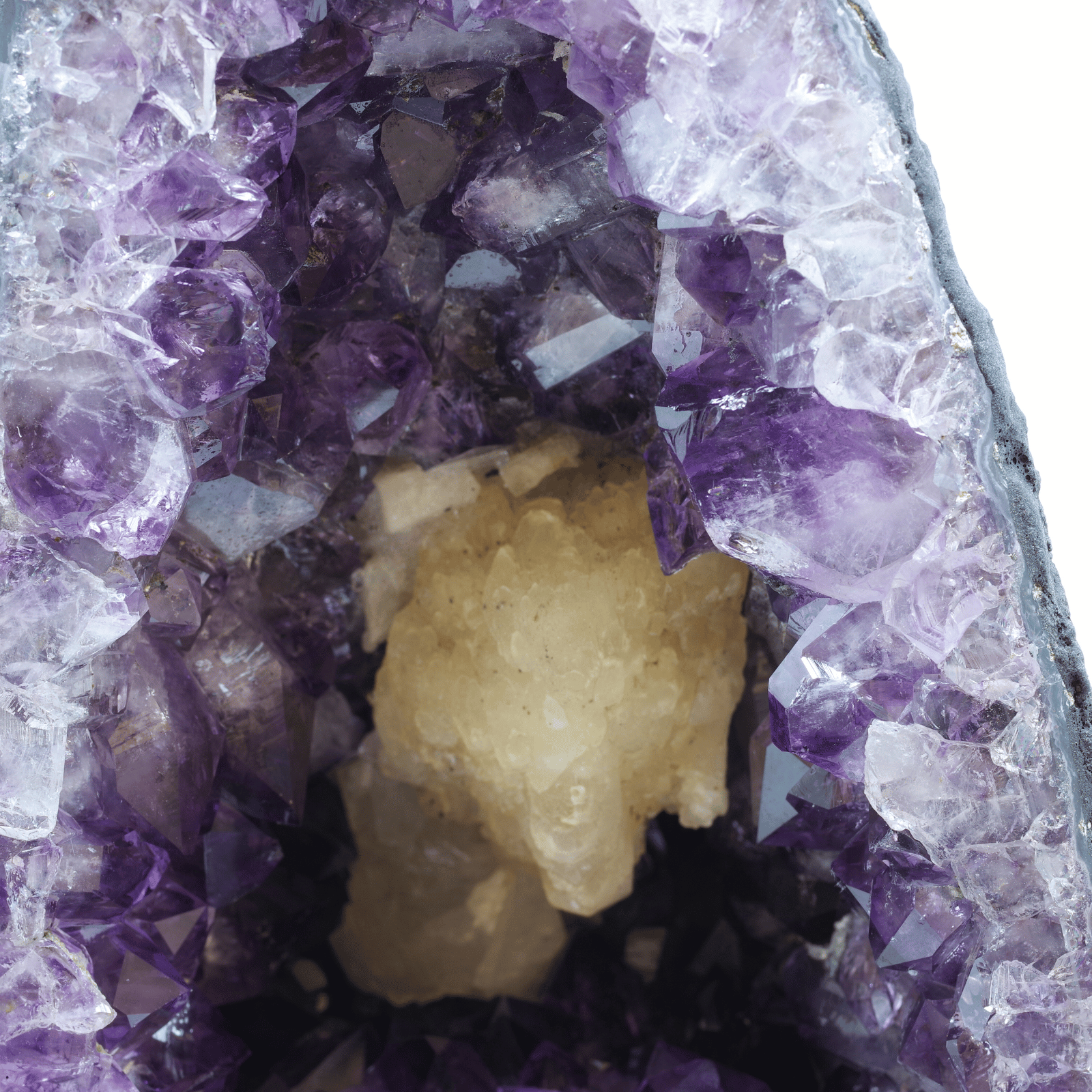 アメジスト(紫水晶)の原石が、岩の内部で自然に結晶化し、洞窟のような空洞の内側にびっしりと美しい紫の結晶を形成したものです。