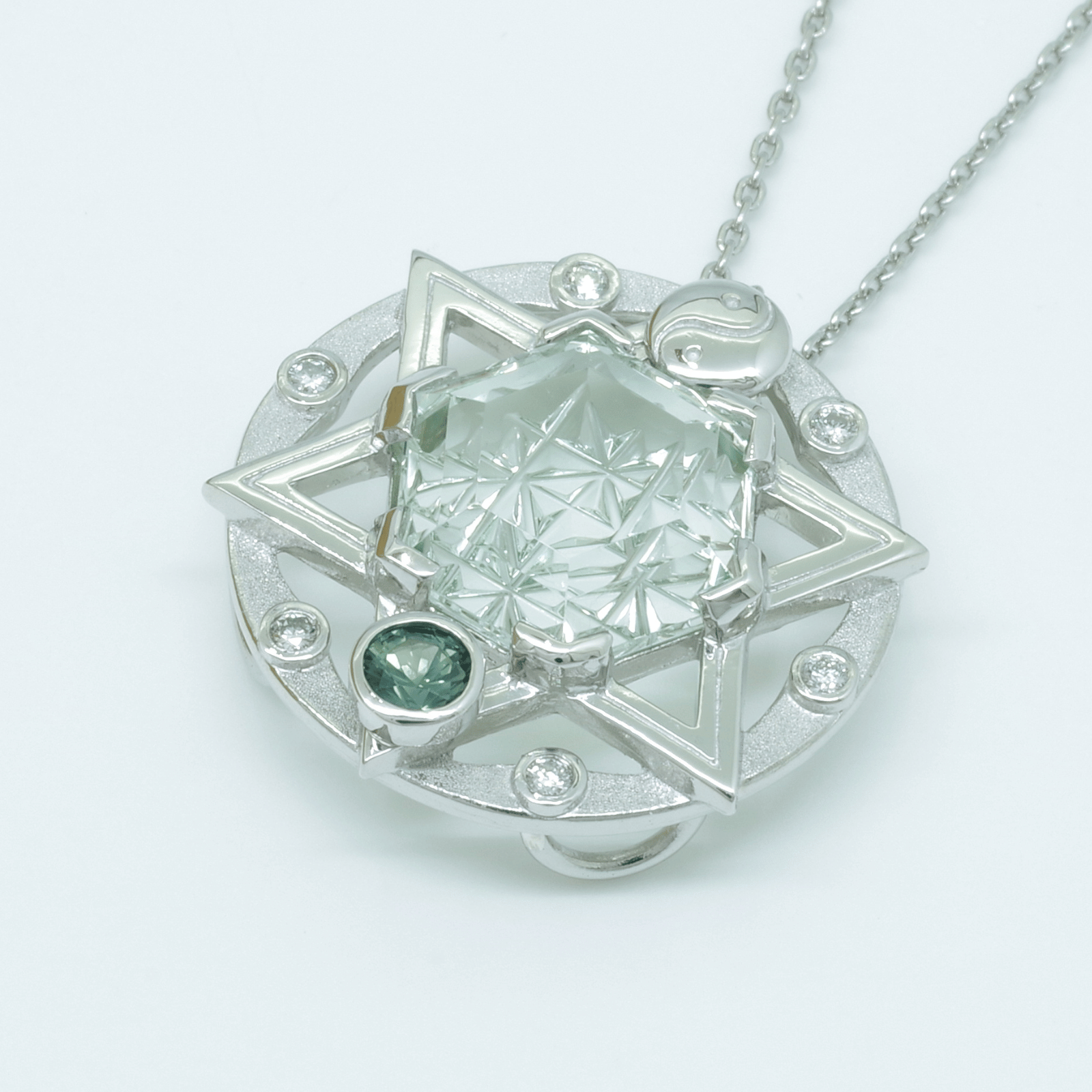 六芒星の魔法陣に、甲州貴石切子の入ったグリーンクォーツ、グリーンサファイヤ、ダイヤモンド、陰陽太極図のモチーフを添えた決断と調和を象徴する守護ペンダントです。